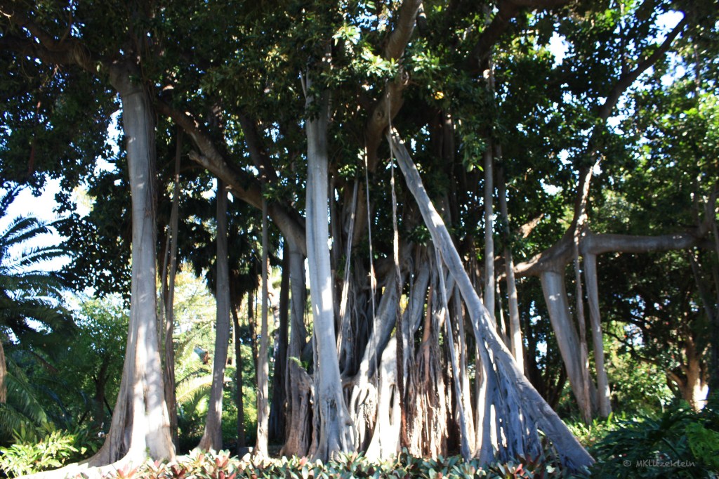 Es gibt hier einfach alles. Wer gerne mal eine Mimose streicheln möchte, der ist hier richtig. Durch Bananenurwälder zu schlendern ist großartig. Den Leberwurstbaum, Kiwibäume, Orangen, sämtliche Palmenarten und bunte farbige Pflanzen, die man sich in den wildesten Träumen nicht vorstellen kann. Dicke, fette Pinien und Brunnenanlagen. Während man so durch die grüne Welt schleicht, die Augen am liebsten überall habend, steht er so überraschend vor dir. Unerwartet. Wie kann sich ein so dicker, riesiger Baum einfach so verstecken?