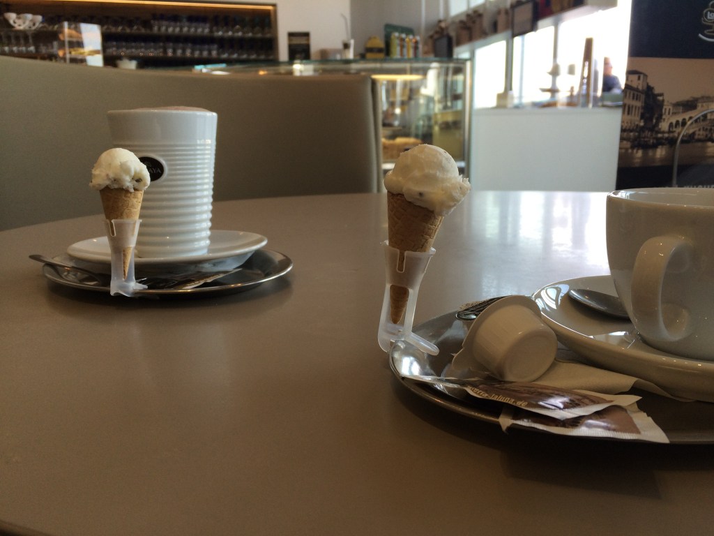 Das, mit dem Minieis ist ja eine putzige Idee. So ähnlich, allerdings nicht mit so einem niedlichen Waffeleishalter, habe ich vorigen Sommer in Kosice (Slowakei) mal einen Espresso genossen. Die Eiskugel gab es in einem kleinen Extraschälchen gratis dazu.