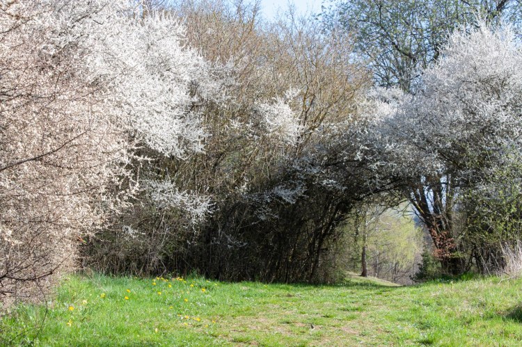 Auf der wohl schönsten Picknickbank gab es dann am Mittag noch unsere mitgebrachten Snacks. Der Himmel in strahlendem Blau, die Wiesen im satten Grün und dazwischen überall die Kirschen und der Weißdorn mit seinem strahlenden Weiß. Als Alternative zum Meerspaziergang kann der Premiumweg definitiv mithalten.