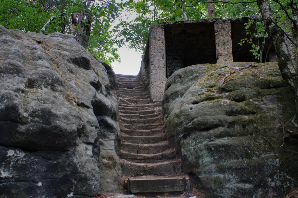 Auch am nächsten Tag machten wir uns noch einmal auf, um die restliche Umgebung zu erkunden. Ich kann als Tipp geben, dass die Wege nach einem Kletterstieg und einer langen Wanderung vielleicht nicht die beste Idee sind. Ich war wirklich fix und fertig. Aber gut. Nach einer Stärkung in der Schokoladenmanufaktur (sehr zu empfehlen!) ging es dann am Schlossgarten vorbei Richtung Höhle. Die fanden wir auch, hinter einem Teich, ziemlich schnell im Wald. Auch hier wieder etliche Stufen, die auf uns warteten. Meine Beine!