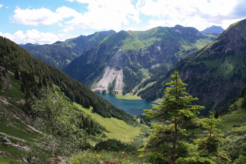 Es führen ja bekanntlich mehrere Wege nach Rom. Wir wählten den, der am Vilsalpsee begann. Eigentlich waren wir uns einig, nur eine kurze Tour zu machen, da es ab Mittag gewittern sollte. Außerdem hätten es mir meine Schienbeine und Knie sicher gedankt. Zum Vilsalpsee kann man zwischen 10 Uhr und 17 Uhr nicht vor fahren. Heißt: Der Weg ist gesperrt und man hat schon eine Strecke zu laufen. Aber wir waren ja zum Glück früh dran. Auto abstellen und erst einmal auf das Naturjuwel schauen. Ich entschleunigte schon automatisch – alleine durch den Blick auf den See.