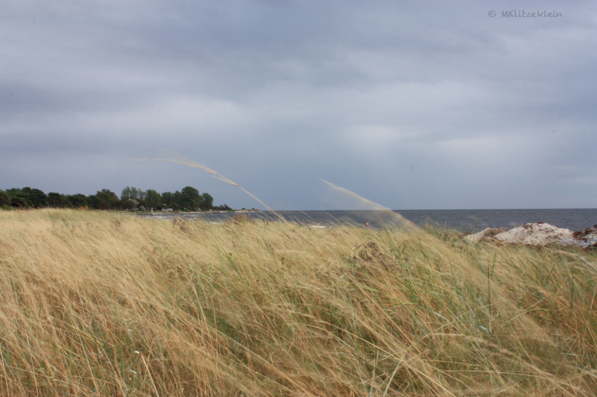 Ein paar Kilometer wollten wir heute aber noch schaffen. Trelleborg durchkreuzten wir einmal, um dann kurz vor Ystad zu landen und uns hier auf einem kleinen Parkplatz breit zu machen. Ernie ging mit seinen 2 m noch als PKW durch. Da es noch nicht so spät war, gingen wir erst einmal wieder ans Meer, schauten uns um. Hier wogen sich die Kiefern im Wind, der mich im Übrigen auch ganz schön durchpustete.