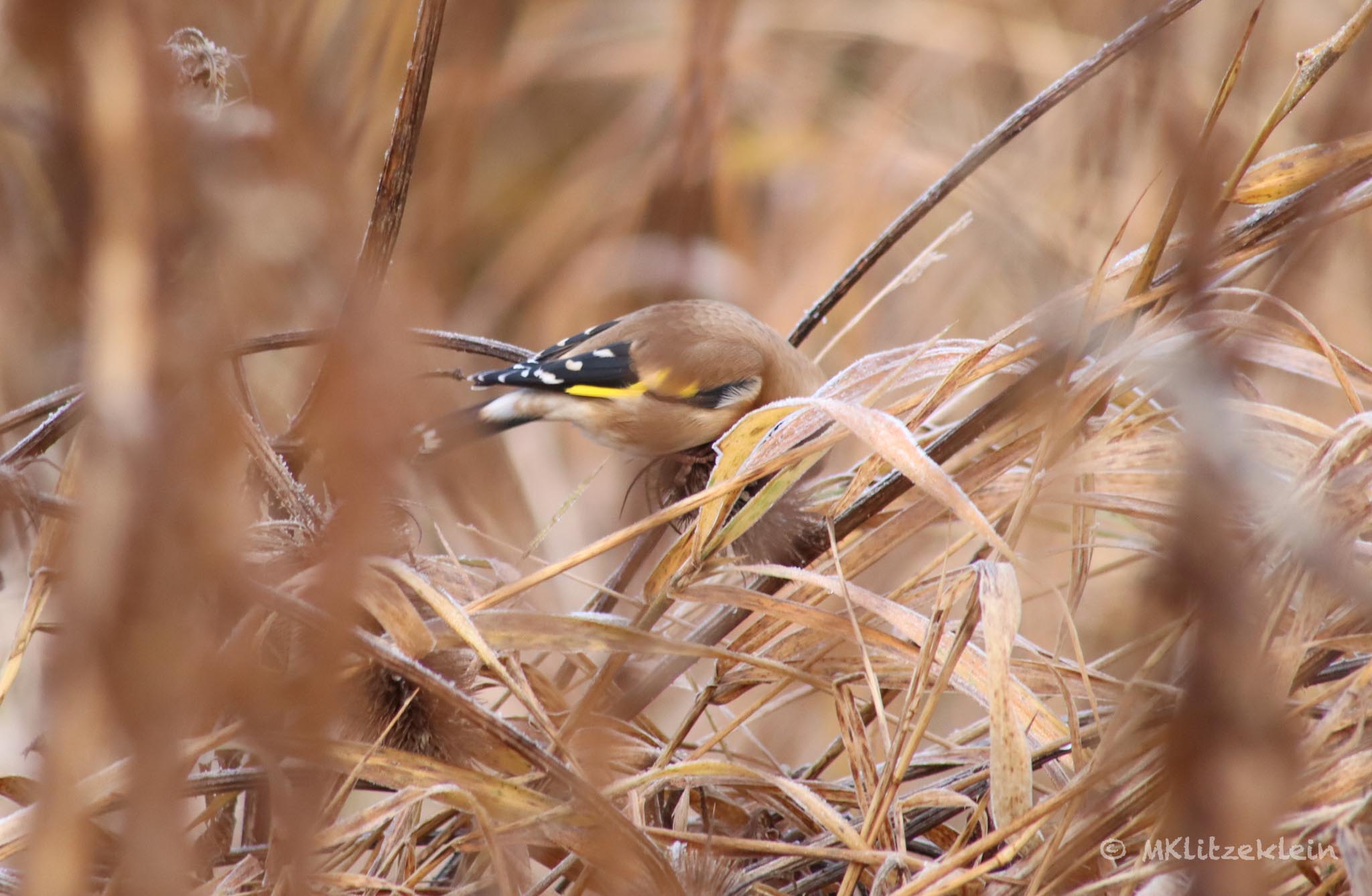 Dann stand ich erst einmal ziemlich lange herum und suchte nach neuen Motiven, neuen Vögeln. Ich hockte hier ein bisschen rum und knipste da ein bisschen. Plötzlich sah ich sie. Ganz langsam und vorsichtig pirschte ich mich an und schaute den kleinen Stieglitzen bei der Futtersuche zu.