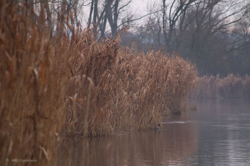 Zuerst ist es diesig. Eine verschwommene, graue Dunstschicht hängt über dem Wasser. Jedes Foto wird unscharf und zumeist auch ziemlich langweilig. Also werden die Augen auf etwas gelegt, was näher am Ufer ist. Das Schilf. Hier verstecken sich die Wasservögel wie Silber- und Graureiher, Haubentaucher, Stockenten. Sie schrecken schnatternd hoch, sobald wir den Steg betreten.