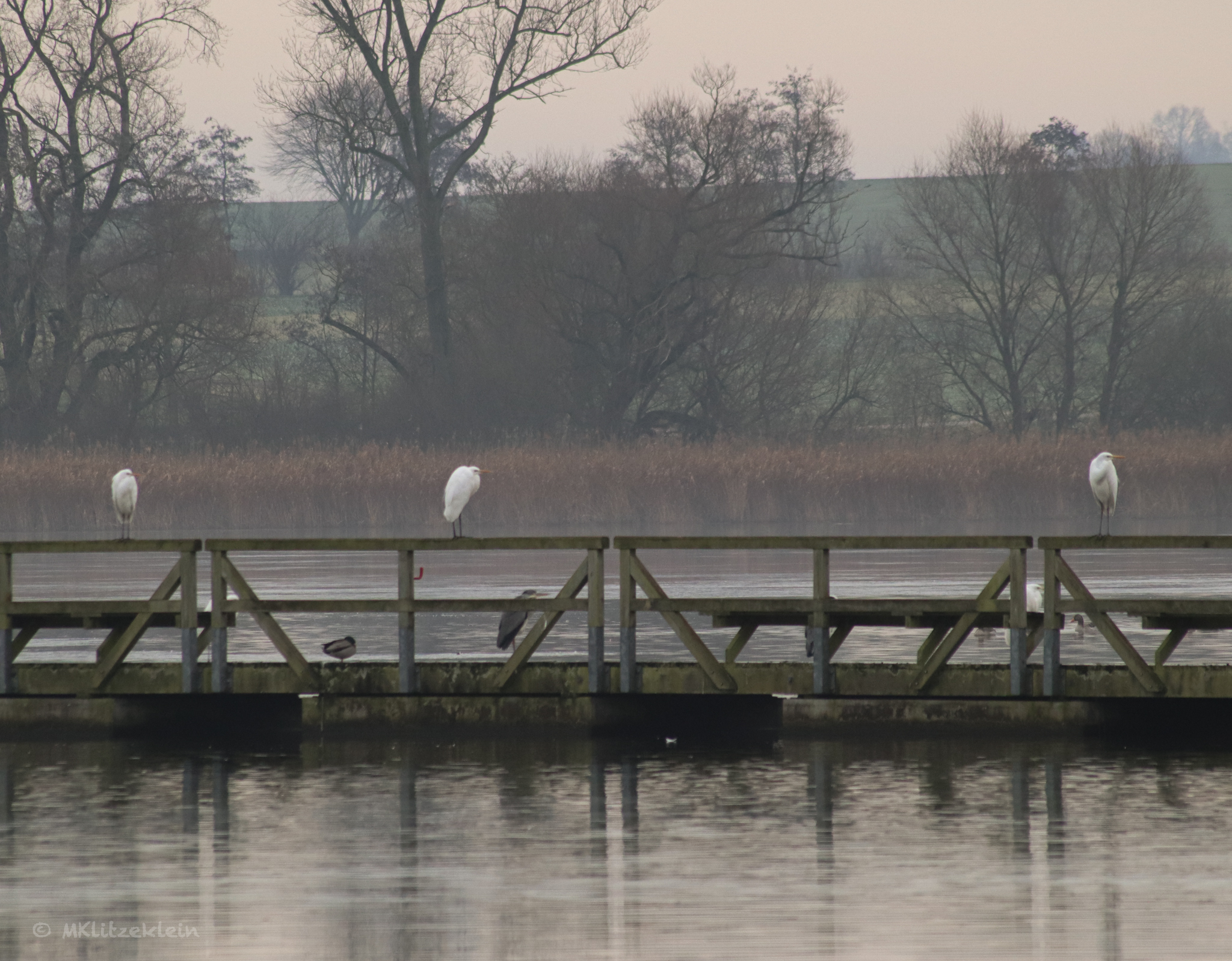 Zuerst ist es diesig. Eine verschwommene, graue Dunstschicht hängt über dem Wasser. Jedes Foto wird unscharf und zumeist auch ziemlich langweilig. Also werden die Augen auf etwas gelegt, was näher am Ufer ist. Das Schilf. Hier verstecken sich die Wasservögel wie Silber- und Graureiher, Haubentaucher, Stockenten. Sie schrecken schnatternd hoch, sobald wir den Steg betreten.