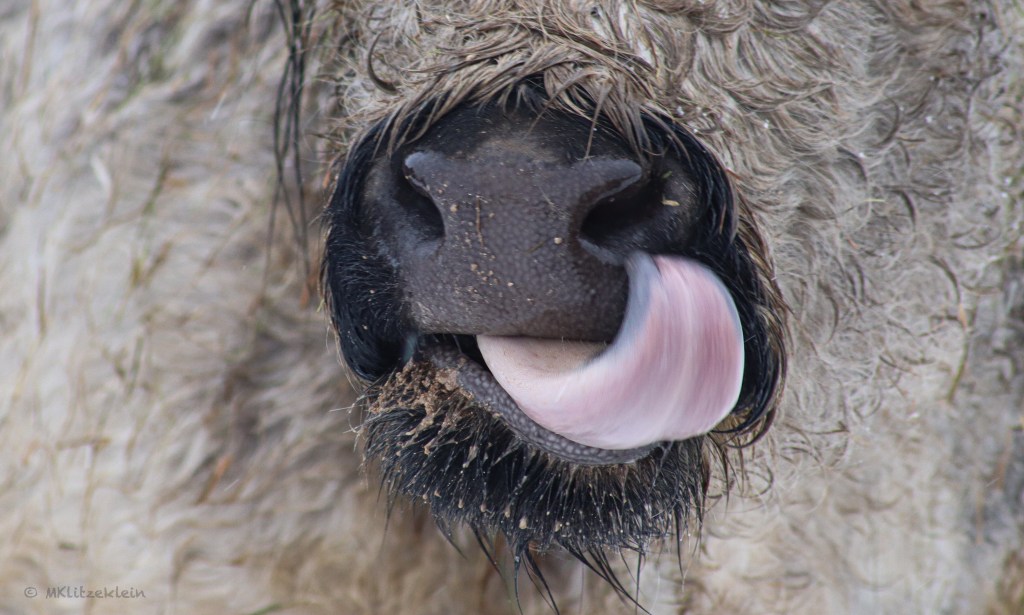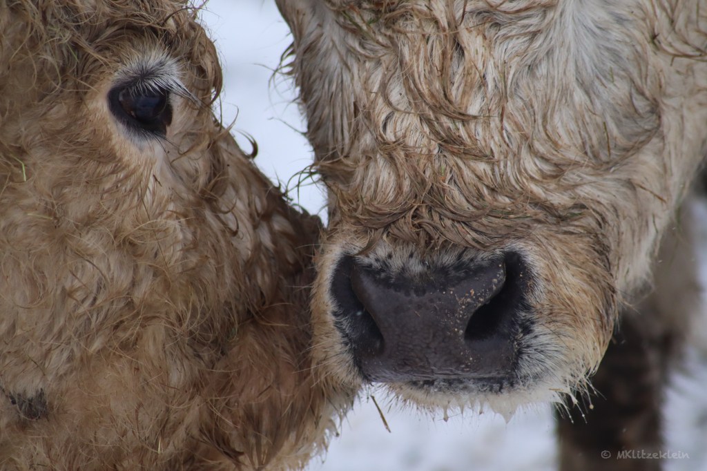Klitschnass sind sie vom Schnee. Das Fell kräuselt sich in Locken. Die Schnuten sind nass von der Futtersuche. Die Hufe scheinen tief eingesunken in der weißen Landschaft. Sie verstecken sich in dem kleinen Wäldchen auf ihrer Wiese. Aber eigentlich sind sie viel zu neugierig, um dort zu verharren. Mit großen dunklen Augen werden wir skeptisch betrachtet.Der warme Atem bildet kleine Wolken vor ihren Mäulern. Ab und zu strecken sie frech die Zunge hervor.