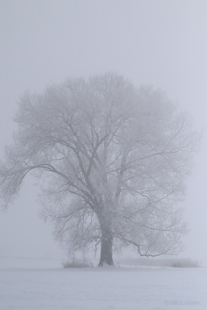 Die morgendliche Runde. An dem Lieblingsbaum vorbei. Posierend wie immer, im Nebel verschwindend. Meine Fotos sind an diesem Tage kaum etwas geworden. Der Nebel ist einfach zu dick. Er hängt tief und lässt einen nichts sehend zurück.