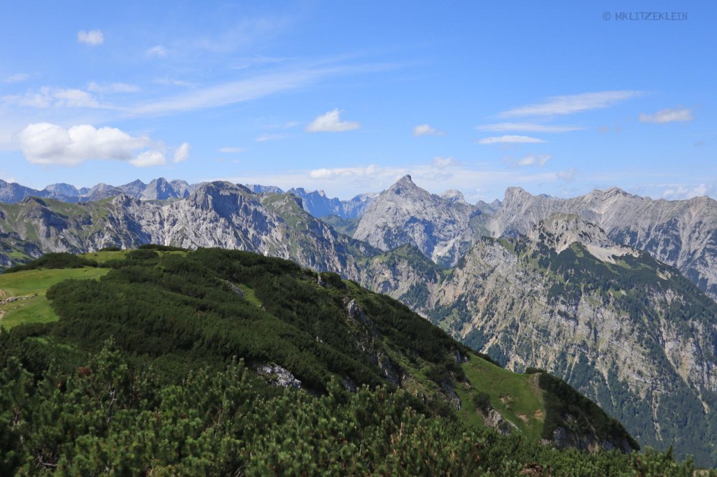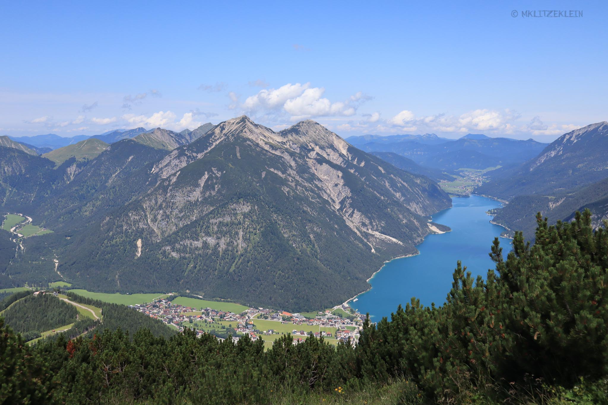 Dann sind wir plötzlich oben. Na gut, so plötzlich kommt der Gipfel ja nie. Die schöne Aussicht hingegen schon. Berge, wohin das Auge reicht. Der Achensee mit seinem herrlichen Blau. Erst mal gibt es einen Snack. Auf den Abstieg freue ich mich ganz und gar nicht, denn von der Wanderung gestern schmerzt jeder Muskel. Ich fürchte um meine Knie.
