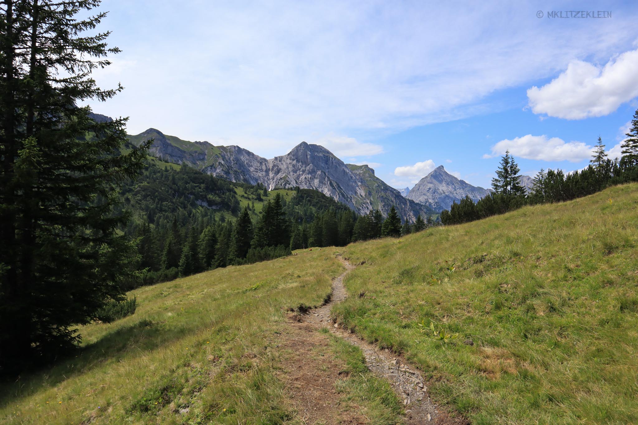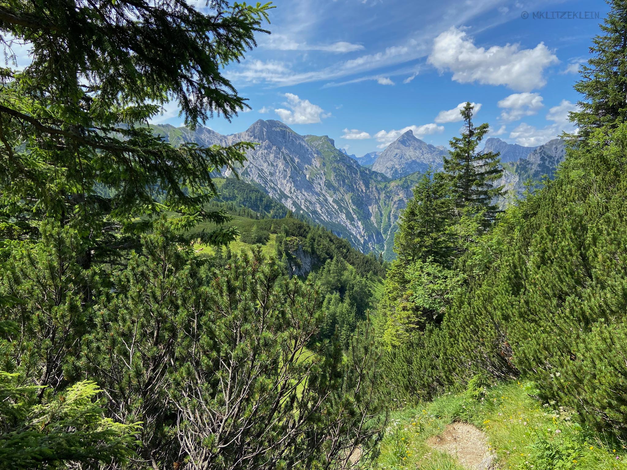 Die ersten paar Kilometer geht es im Regen los. Danach nur noch strahlender Sonnenschein. Ich schüttle mal wieder den Kopf – wieder kein Sonnenhut dabei. Dafür aber Punktimdunkeln und L, die auf dem breiten Weg nach oben die Aussicht auf den Achensee genießen. Der Weg ändert sich irgendwann. Er wird schmal und führt durch einen schattigen Waldabschnitt. Plötzlich sind hier Menschen unterwegs, wo wir vorher keinem einzigen begegnet sind. Hinter der Alm tummeln sie sich dann alle. Ab hier wird der Weg wieder sonniger und steiler, aber auch wunderschön.