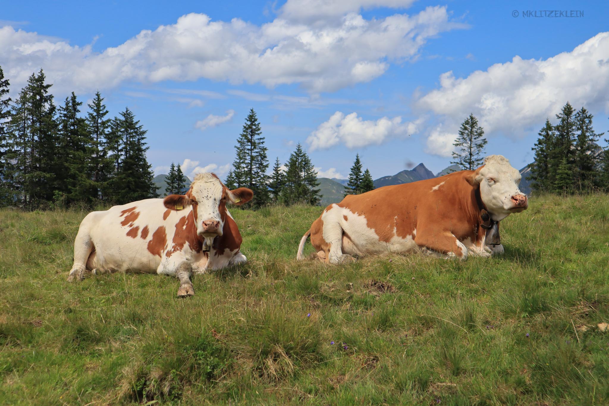 Auch hier wieder schmale Pfade und die Weite der Berge. Die Sonne knallt ordentlich auf den Kopf. Zwischendrin begegnen wir einigen Kühen. Seit letztem Jahr bin ich diesen Artgenossen gegenüber vorsichtig. Diese hier scheinen aber äußerst entspannt zu sein und kein Interesse an uns zu haben.