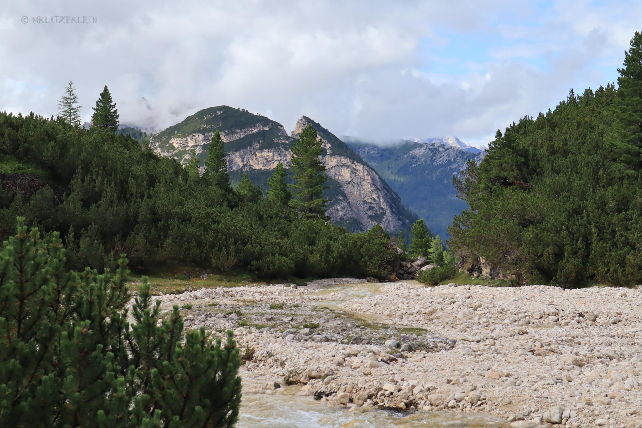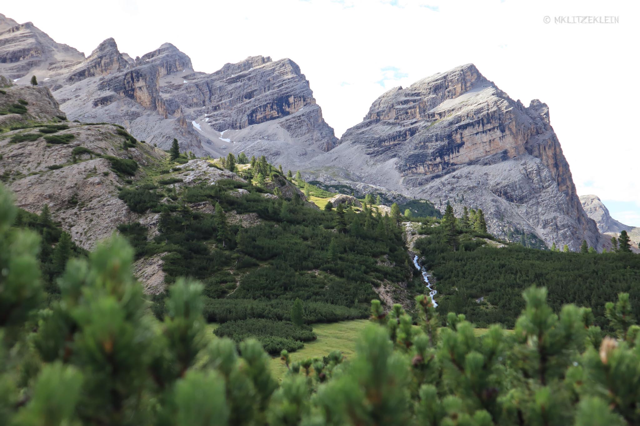 Es war kein Mensch unterwegs. Einerseits liebe ich diese Ruhe und morgendliche Stimmung, andererseits kannte ich mich hier nicht aus, hatte kein Handyempfang und es gab Bären. Die Wege waren teilweise rechts und links zugewachsen von dunklen, verwucherten Kiefersträuchern. Da hätte sich ein Wolf, ein Mensch oder ein Bär verstecken können, ohne das ich ihn entdeckt hätte. Zudem ging es mal wieder ordentlich steil bergan. Meine Lunge brannte, aber stehenbleiben kam heute Morgen erst in Frage, wenn ich meine Umgebung etwas besser überblicken konnte. Und diese Landschaft kam. Sobald ich oben auf dem Aussichtspunkt war, folgte danach der Dolomiti Höhenweg. Flache Fläche zwischen wunderschönen, riesigen Bergen. Bäche und Flüsse musste ich kreuzen. Die Brücken waren gefroren. Ich war dankbar um meine warmen Sachen und ich war verliebt. Ein bisschen fühlte ich mich auch wie auf einer Expedition oder in einem wilden Film.