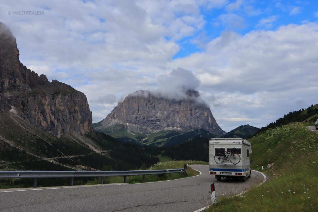 Es war noch immer kalt in den Dolomiten, aber der Abschied fiel uns trotzdem schwer. Alle Sachen auf’s Neue verstauen, Ernie starten und dem Campingplatz „Adé“ sagen. Das Gefühl vom Yosemite hatte mich übrigens bis zum Schluss nicht verlassen. Bevor wir aber ganz Abschied von den Bergen nahmen, düsten wir erst einmal noch eine ganze Weile kurvige Straßen hinauf und wieder hinunter. Düsen ist mit so einem alten Auto übrigens maßlos übertrieben. Irgendwann waren wir dann ganz froh einen Wohnwagen vor uns zu haben, der ungefähr in unserem Tempo fuhr. Hinter uns zog sich die Karawane.