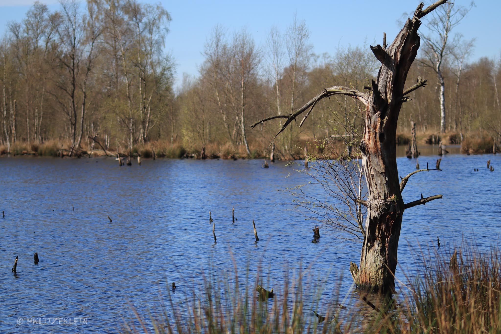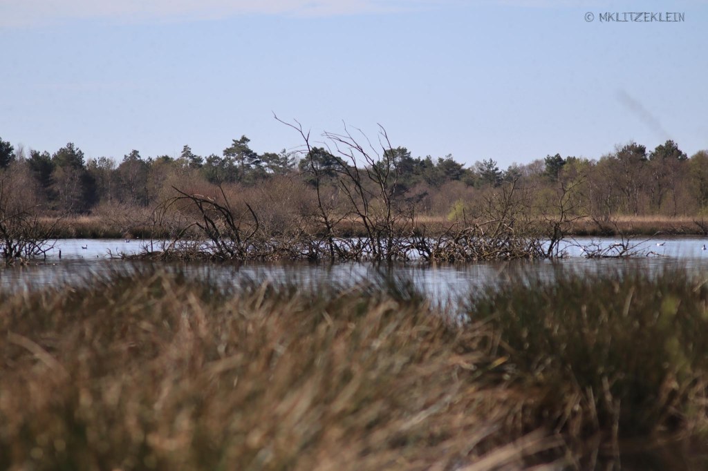 Ganz unverhofft trafen wir dann sogar noch auf einen Fischadler. Der ruhte sich in weiter Ferne, weit ab vom Trubel der Spazierwege, auf einem Ast aus und starrte ins Wasser. Überhaupt war dieses Moor hier ein wahres Vogel- und Insektenparadies.