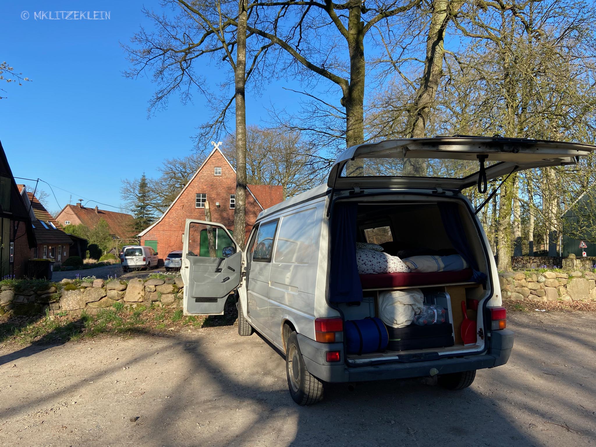 Nicht nur Lärm kann die Ruhe stören, auch Gerüche. Und davon gab es in dieser Nacht zu viele. Im Dachzelt unseres Busses konnten wir es nicht aushalten, da die weit entfernten Nachbarn des Stellplatzes Osterfeuer veranstalteten. Sie verbrannten nicht nur Gehölz, zumindest roch es, als hätten sie ihre ganzes Mobiliar verbrannt. Am nächsten Morgen war der Spuk zum Glück zu Ende, die Sonne schien und die Ruhe hielt an.