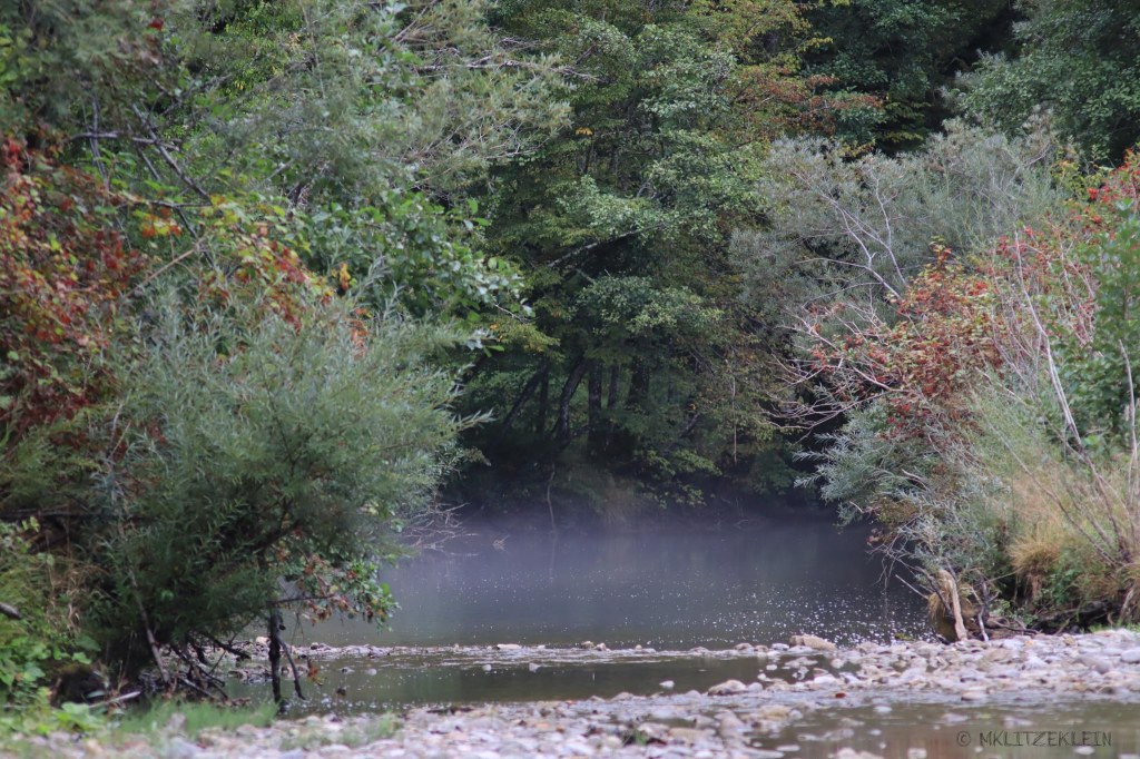 Da der Fluss nicht wirklich viel Wasser führte, kraxelten wir über ein paar Steine hinweg in die Mitte. Wir standen mitten im Fluss und das mit trockenen Füßen. Es war unglaublich still, kein einziges Geräusch war zu hören. Der abgezogenen Regen schaffte eine mystische Stimmung.