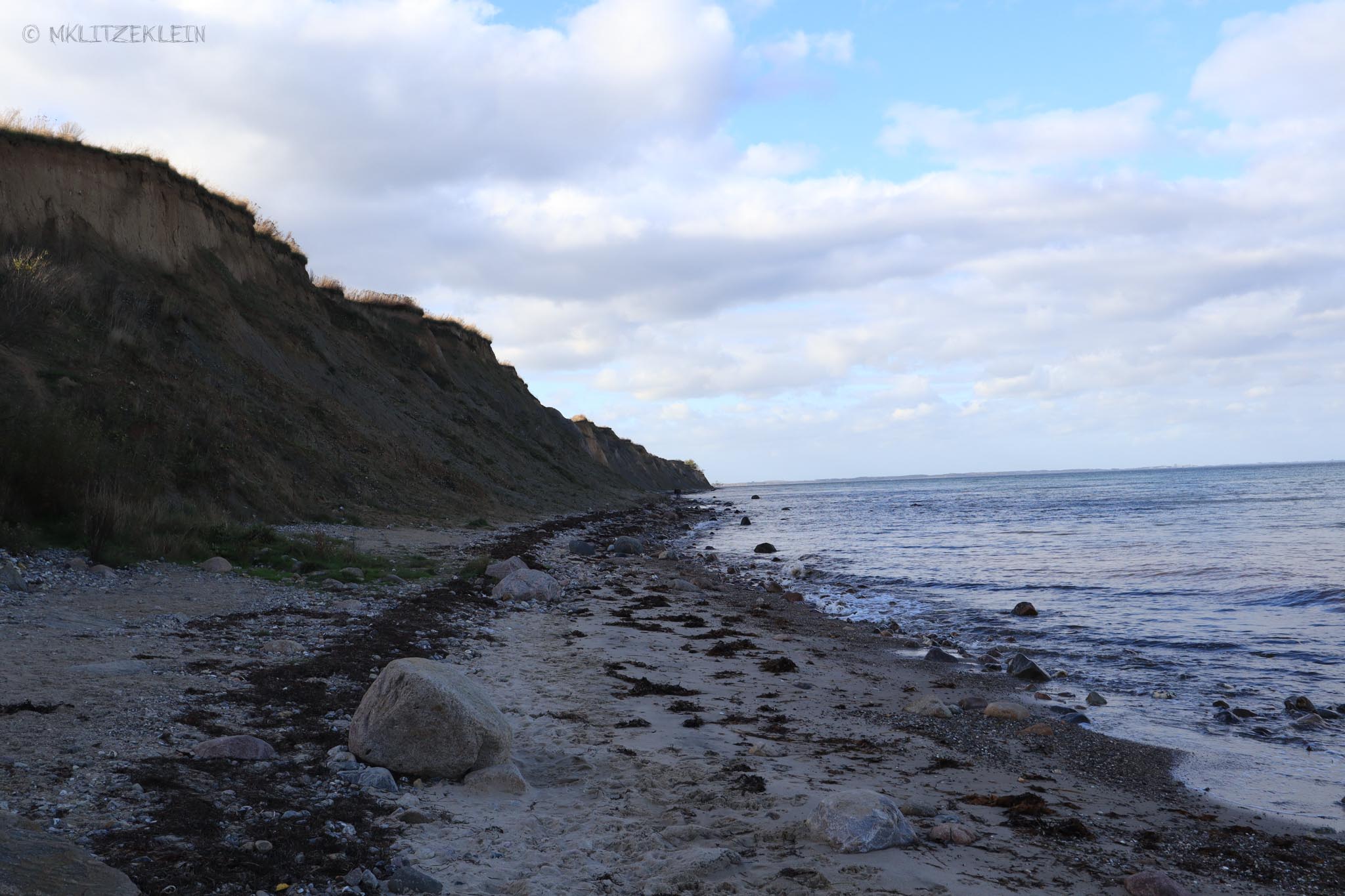 Kaum um die Kurve der Landspitze herum, hatten wir es auch schon herausgefunden: Dieser Weg würde uns zum Klärwerk bringen. Aber auch zur Steilküste. Genau das war der Weg, den ich einschlagen wollte. Ich bin eine große Fanin von Steilküsten. Wohl oder übel ging es dann aber doch noch am Klärwerk vorbei. Immerhin lag etwas weiter am Weg auch noch der Aussichtspunkt „Eckernförder Blick“. Hier saßen wir einen kurzen Moment und schauten auf das Meer. Und plötzlich regnete es hunderte Buchenblätter. Was für ein Anblick.