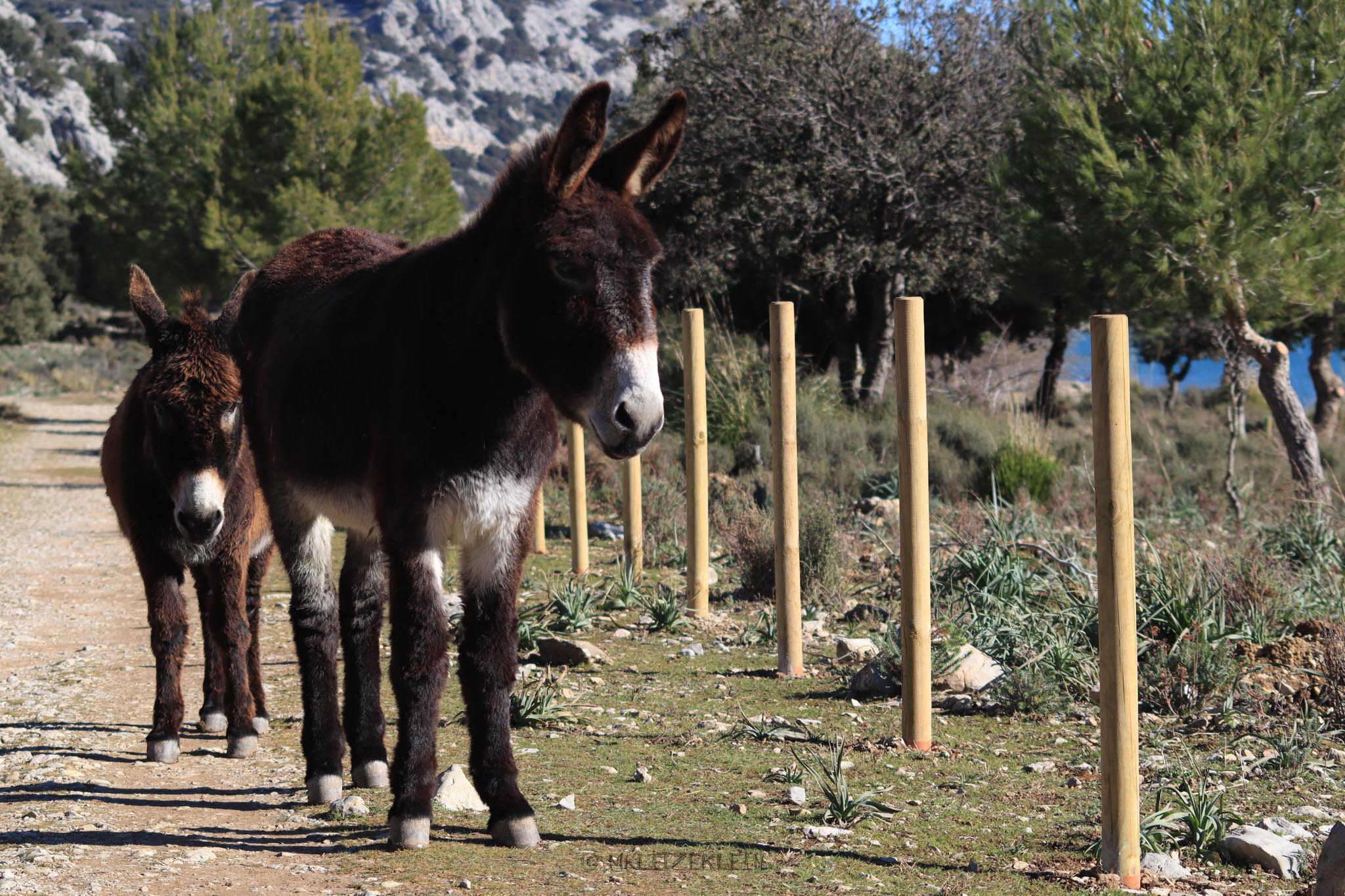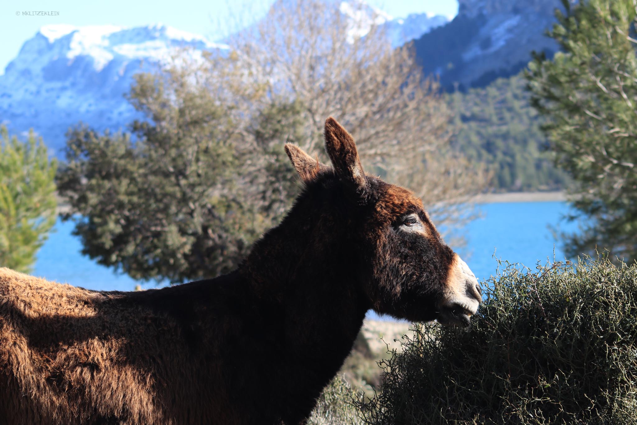 Jedes Mal wenn wir am Stausee eine Wanderung machen, treffen wir früher oder später auf die Esel, Pferde und Schafe. Dieses Mal waren es besonders viele. Die beiden kuscheligen Langohren begleiteten uns eine ganze Ecke unseres Weges. An unserem Picknickplatz, der kurz vor dem Aufstieg des Gipfels lag, drängten sich dann zwei Esel sehr unverschämt auf. Sie wollten unbedingt von unseren Leckereien ab haben. Wir mussten uns tatsächlich auf die höheren Felsen retten, damit die kleinen hungrigen Schnuten uns nichts klauen konnten.