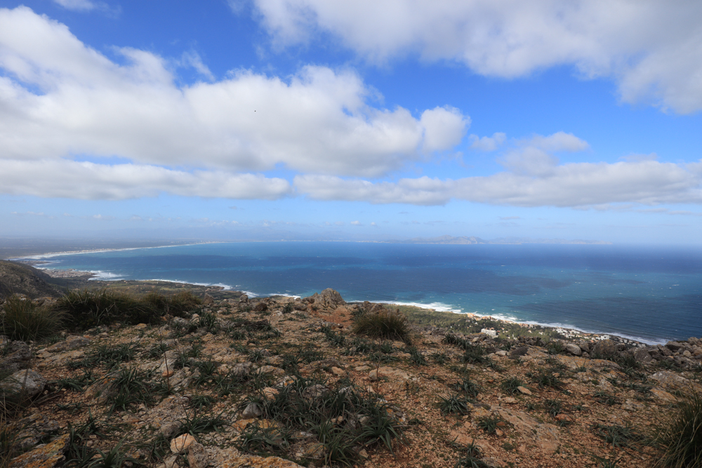 Auf dem kleinen Gipfel, der unser heutiges Ziel war, wurden wir dann fast weggepustet. Gegen den Wind gestemmt standen wir da und schauten auf die vor uns liegende Bucht. Schnelle Fotos wurden geschossen. Man konnte wirklich nicht lange still stehen.