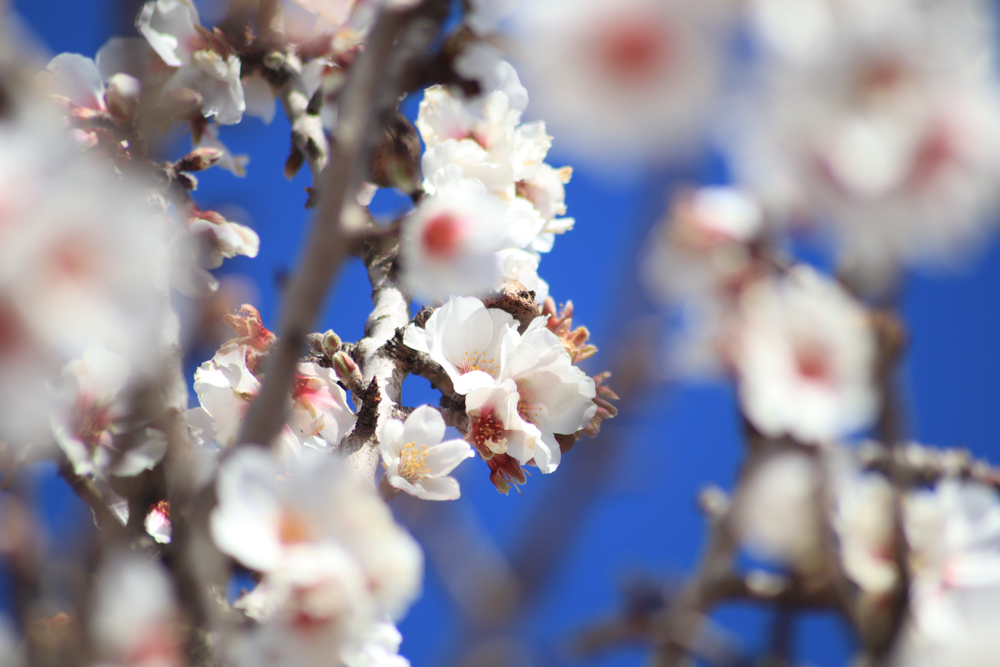 Hier im Tal schien es generell etwas wärmer zu sein. Die Mandel stand in voller Blüte und endlich konnte ich die herrlich zarten Blüten fotografieren. Mit blauen Himmel im Hintergrund ein echtes Urlaubs- und Frühlingsfoto.