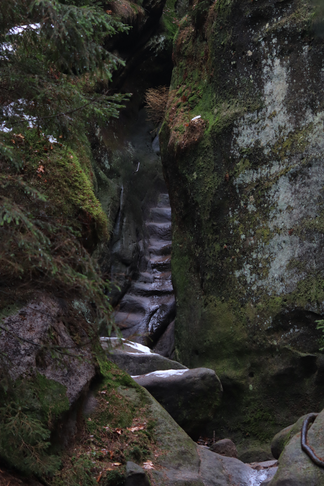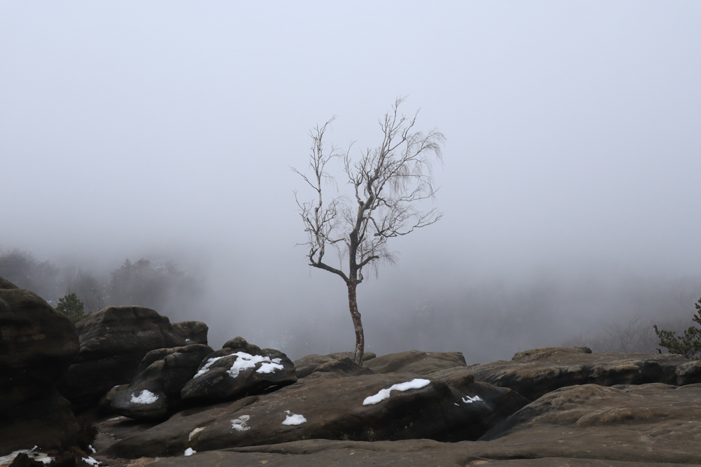 In den vier Tagen, an denen wir in der Sächsischen Schweiz waren, haben wir wirklich alle Wetterlagen mitbekommen. Beginnend mit Nebel, über Regen, hinzu Schnee und Graupel bis zum warmen, sonnigen Frühlingswetter. Als wir uns zum Carolafelsen aufmachten, zeigte es sich nasskalt, fast frostig.