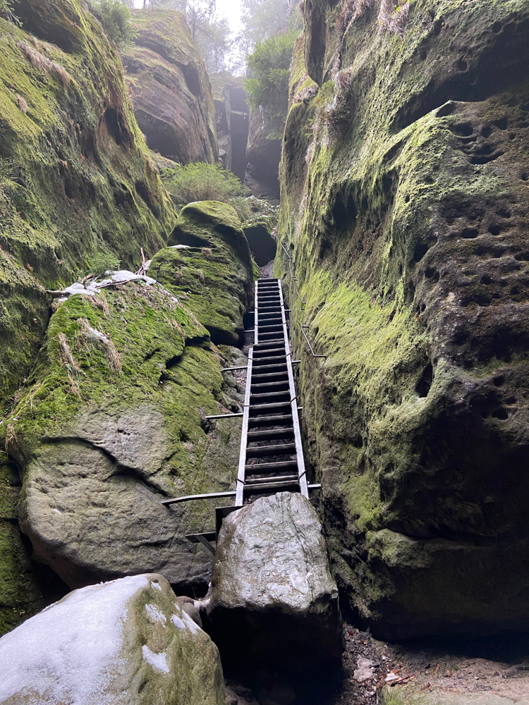 Bis wir dann in die Wilde Hölle kamen. Vor einiger Zeit war ich diesen Weg schon einmal gelaufen – allerdings von oben nach unten. Heute war es andersherum und wir hatten unsere Eltern dabei. Der Weg beinhaltete einige Eisenleitern, Kletterpartien und enge Abschnitte. Die Eisenstufen waren eingefroren, auch auf den Steinen hatte sich das Eis noch gehalten.