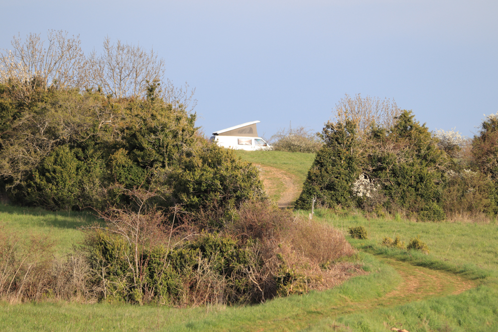 In diesem Fall ist das ein kleiner Wiesenstellplatz bei Cogny. Erstmal eine halbe Stunde durch Weinanbaugebiet juckeln (Fromage, Croissant et vin) und mit einem mal schaukeln wir auf die Wiese. Das ist mal ein Platz! Aussicht auf die umliegenden Berge und umgeben vom Frühling.
