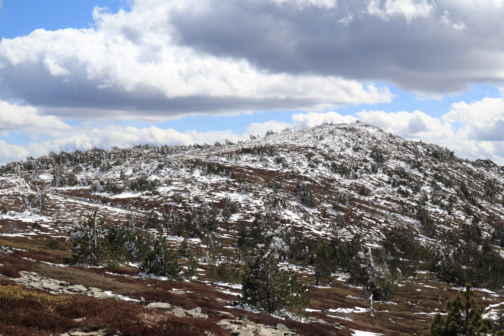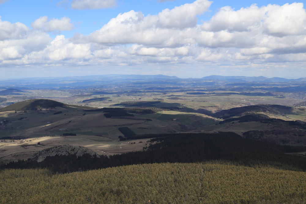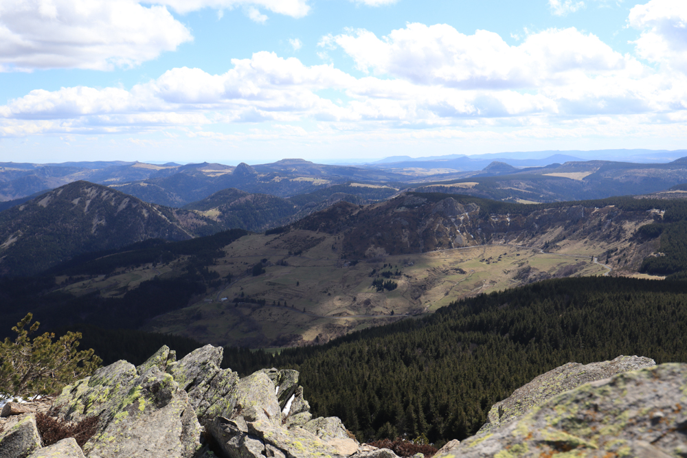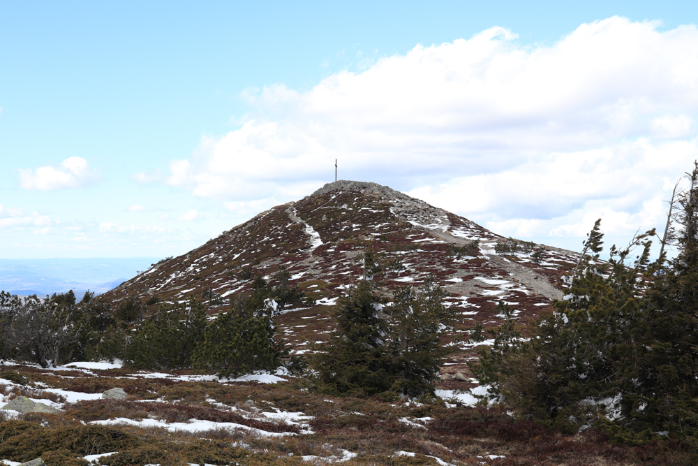 Der Weg auf den Gipfel des Mont Mezenc ist rutschig, schlammig, sonst aber wenig anspruchsvoll. Das große Gipfelkreuz ragt sichtbar empor und schon nach kurzer Wegstrecke sind wir oben angekommen. Eine wunderschöne Sicht auf das Land liegt uns zu Füßen. Der Schnee schmilzt von den kleinen Kiefern. Im Windschatten ist es schön warm.