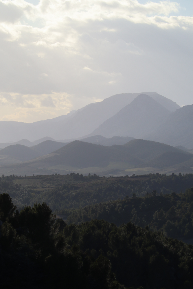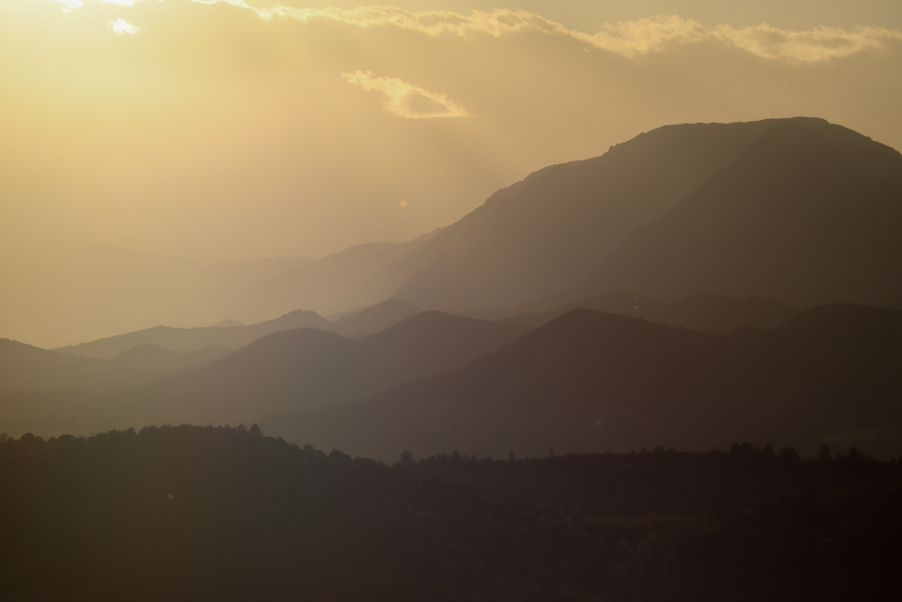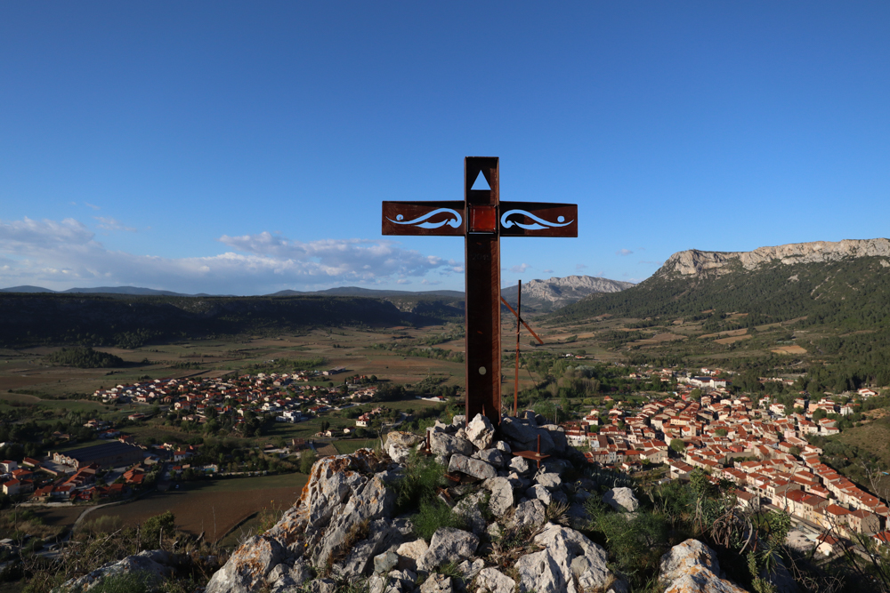 Für den Sonnenuntergang wollten wir zum Croix de Tautavel. Der Wind unser stetiger Begleiter. Er bog die Bäume krumm und ließ mich schwanken. Ein schmaler Pfad, mit kleinen Kletterpassagen (oder für große Leute: mit großen Schritten) führte auf den Berg hinauf. Das Plateau war zum Glück sehr breit, sodass keine Gefahr bestand, dass mich der Wind gleich mitreißen würde. Erstmal die Aussicht auf den kleinen Ort und die Ruine, sowie den Turm genießen.