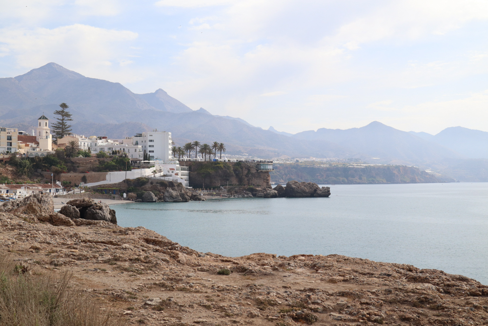 Das komplette Gegenteil von einem kleinen, verschlafenen Bergdorf im Hinterland Spaniens ist ein Ort an der Küste Südspaniens. Am Strand entlang laufen wir ca 1,5 km bis Nerja. Hotel reiht sich an Hotel. Menschen schlendern auf der Promenade entlang. Sie liegen am Pool der ersten Reihe Hotels, morgens um 9 Uhr schon. Kleine Restaurants und Cafes bieten das typische Touristenmenü an – auch einen Cocktail zum Frühstück, wenn mans mag.