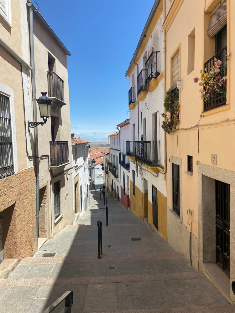 In Caceres führte uns unser erster Weg durch die belebte Fußgängerzone zielstrebig ins Burgerrestaurant. Nach Speis und Trank waren wir viel erleichterter, pappsatt und müde. Die Beine vertraten wir uns dann in der alten Innenstadt. Hier schien ein Mittelaltermarkt plus Event stattzufinden. Außerdem war das die erste Stadt, in der es Straßenmusiker gab. Jetzt wo ich sie dort gehört und gesehen habe, fiel mir erst das Fehlen in den anderen Orten auf. Mit guter Musik und Gesang bummelten wir zurück zum Van.