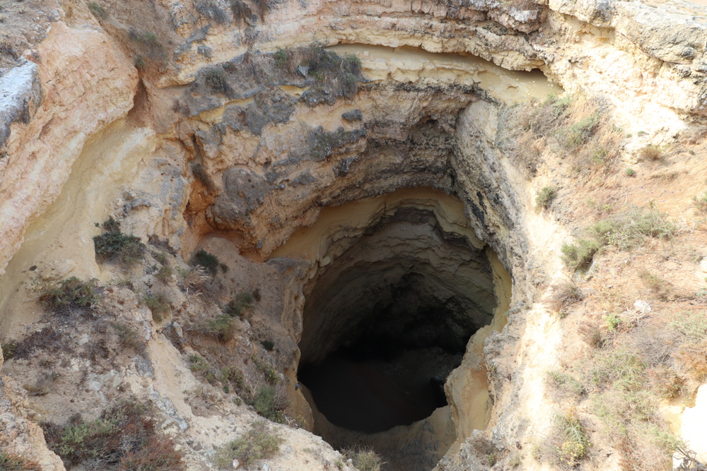 In die andere Richtung zeigt sich die Küste ebenfalls ganz kantig, ganz scharf, ganz wild. Vor allem hat sie mehrere, sehr tiefe Löcher. Unten toben die Wellen im Dunkeln. Man muss die Augen sehr zusammenkneifen, um in der Tiefe etwas zu erkennen. Außerdem führt nur eine kurze vergitterte Brücke über die Kante des Lochs. Nachdem wir die halb zerstörte Brücke vorhin überquert haben, schießt mir kurz die Frage in den Kopf, wann diese Aussichtsplattform wohl zuletzt mal jemand gewartet hat.