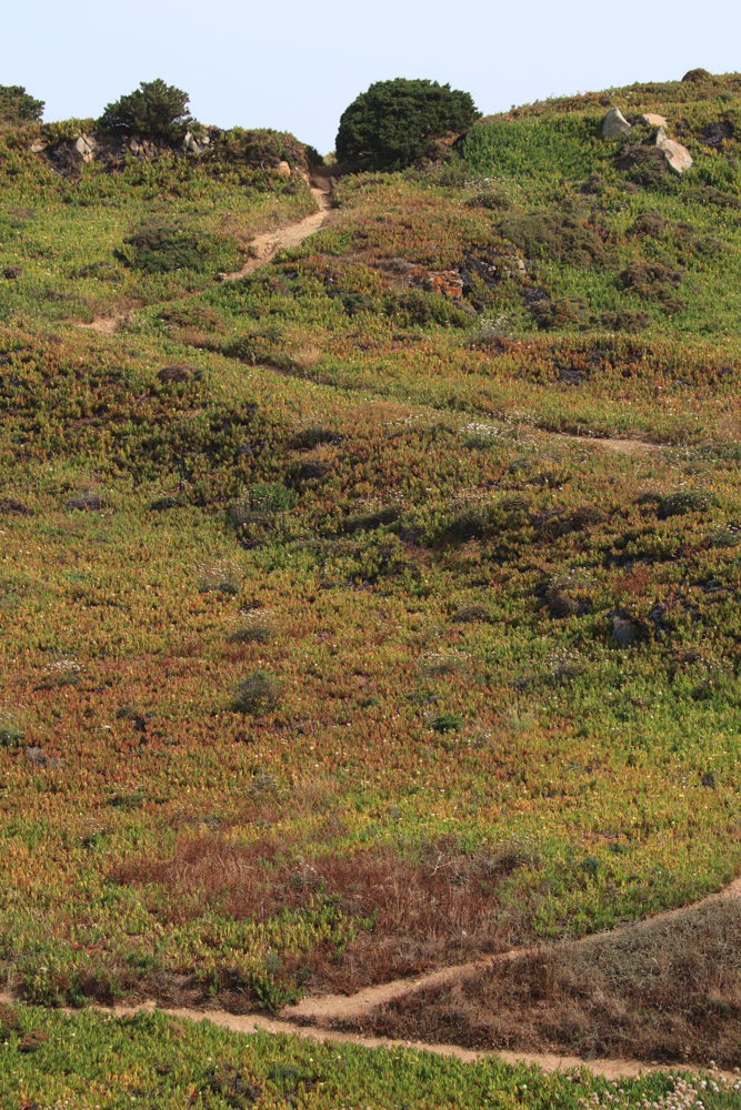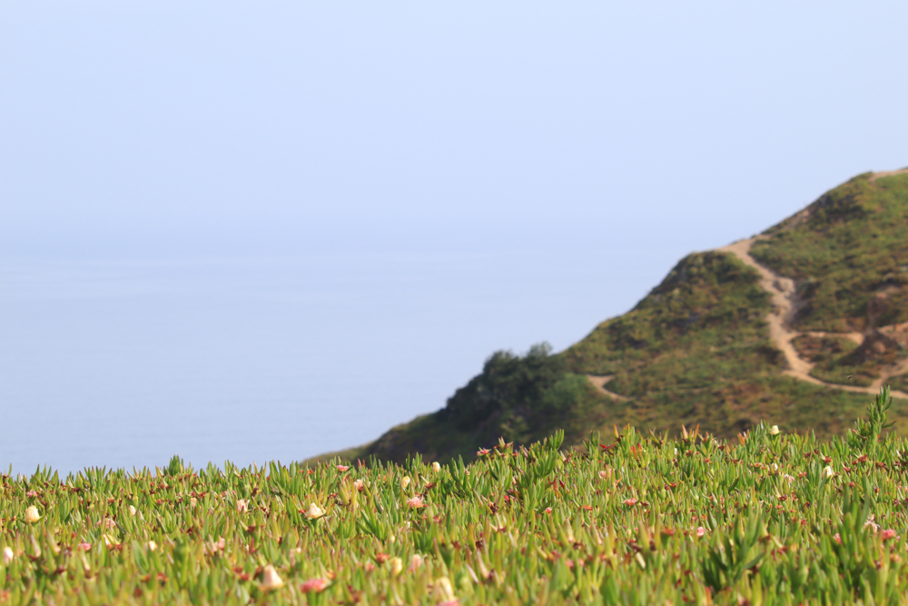 Auf dem schmalen Wanderpfad auf den hohen Klippen sind unendlich viele Pflanzen zu sehen. Alles ist grün. Die gelbe Mittagsblume bedeckt quasi den ganzen Boden. Ihre Blüten sehen aus wie die Spiegelung der Sonne. Kleine runde gelbe Sonnen wachsen am Boden. Dahinter das Meer im mittlerweile blauen Kleid. Das Grau wurde abgelegt. Bienen hängen an den Disteln und die kleine Vögel zwitschern aufgeregt. Es summt, brummt, trällert. Die Welt scheint in vollem Einklang mit sich.