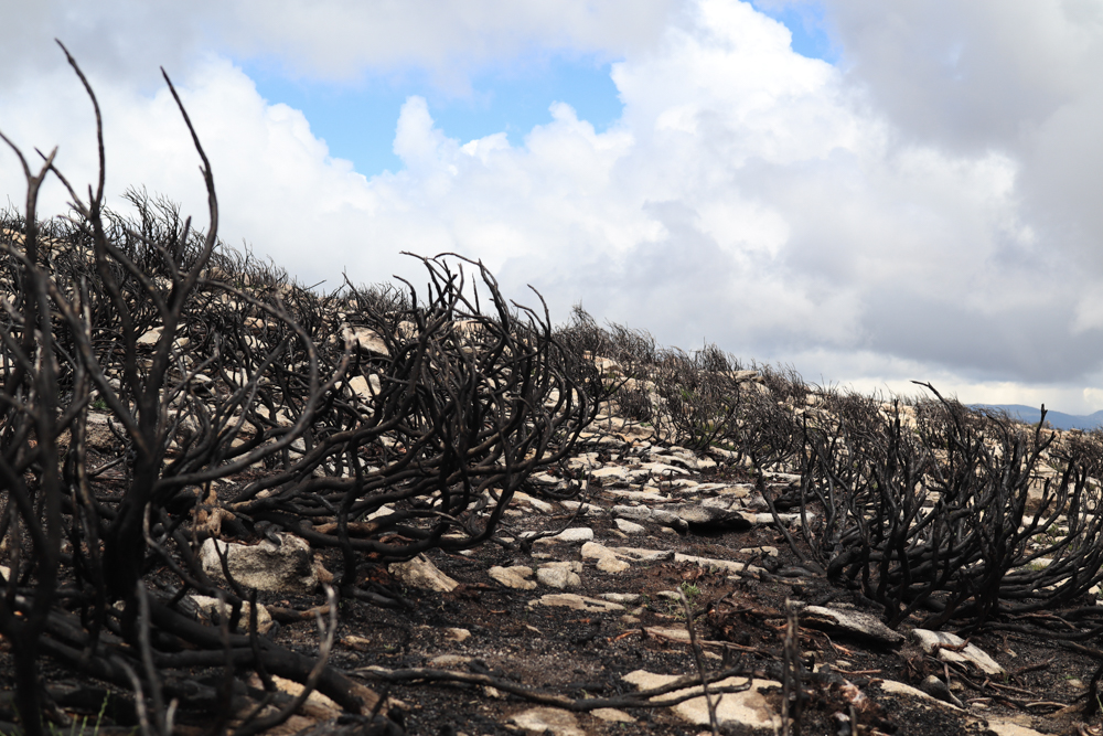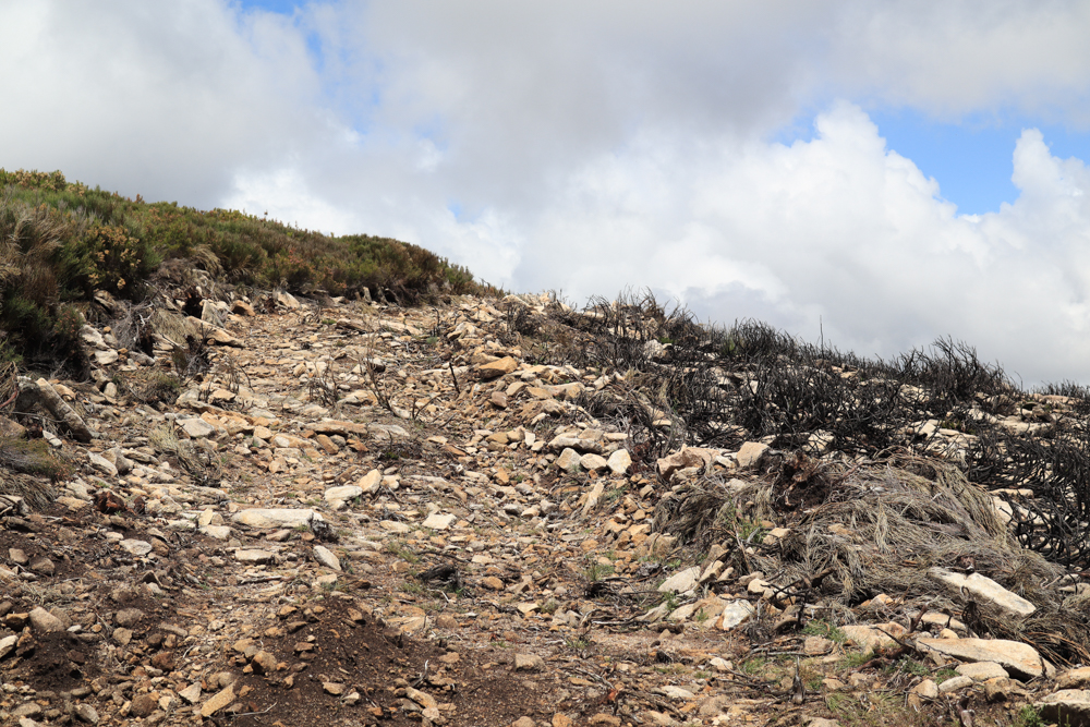 Auf dem Wanderweg geht es weiter, bis wir irgendwann merken, dass der Weg die alte Brandschneise sein muss. Rechts totes Land. Alles verkohlt und dunkel, nur ein paar Gräser wachsen bereits wieder. Der volle Kontrast auf der linken Seite: Grüne Büsche, Pflanzen mit lila, gelben oder weißen Blüten und dahinter der höchste Gipfel des Parks. Ein Hubschrauber fliegt Manöver. Hinter uns ruft ein Hirte seine Schafe zusammen. Das Läuten der Glocken schallt über das Land. Der Weg führt durch Büsche und Bäche. „Zecken“, denke ich und freue mich über meine langen Klamotten. Der Freude zum Trotz hat sich am Abend doch eine dicke Zecke ihren Weg an meinen Hals gebahnt. „Ekelhaft!“, denke ich und bin froh, dass sie so schnell entdeckt wurde. Doch die Wanderung verlor durch diesen Vorfall nichts an Schönheit. Diese blühenden Sträucher und Büsche waren nach all der verbrannten Erde ein wahrer Genuss.