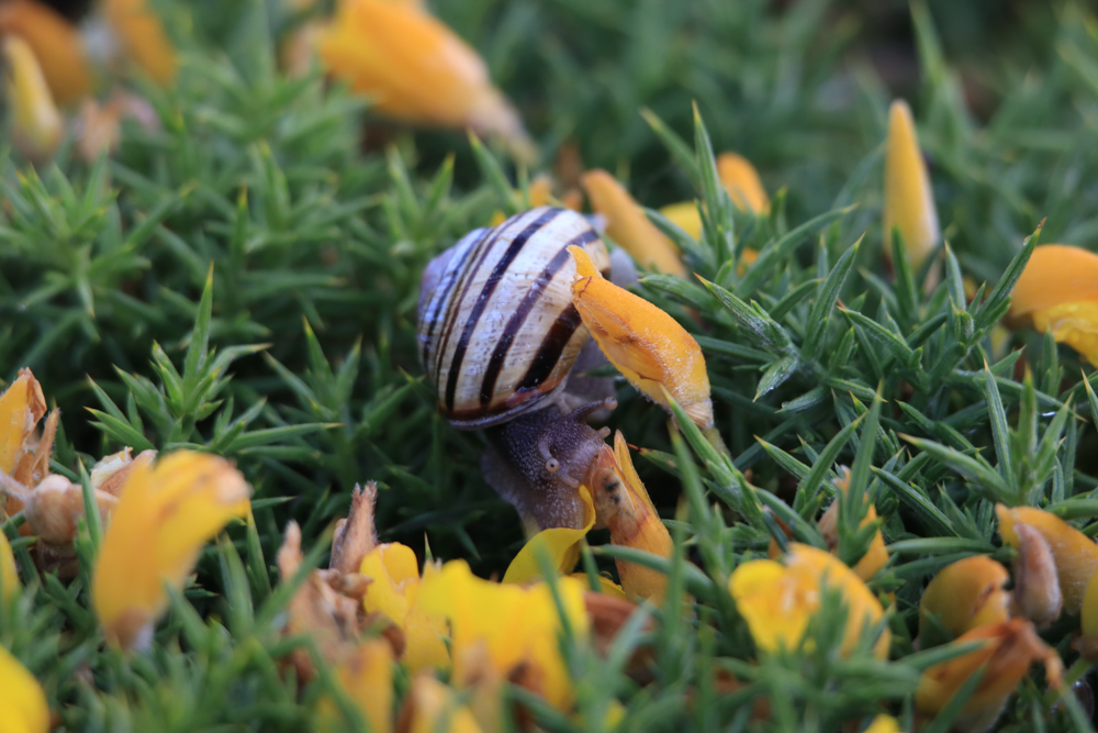 Schnecken tummelten sich auf den Wegen. Sie schauten neugierig aus ihren Häusern heraus. Die Angst vor dem verheerenden Knacken unter der Schuhsohle wuchs mit jedem Schritt. Stehen bleiben, Fotos machen, vorsichtig weitergehen. Schwarzkehlchen, Dompfaff und Bluthänflige unterhielten sich beim Abendgespräch.