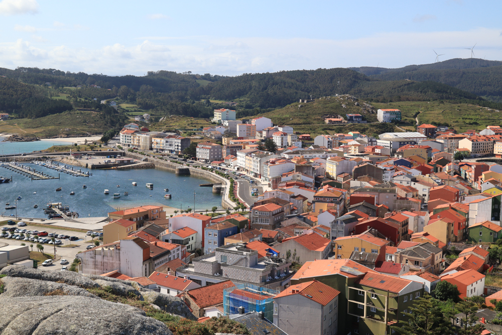 Am nächsten Morgen verließen wir nach ausgiebigen Genuss der Ruhe unseren kleinen Platz und machten uns auf den Weg nach Muxia. Der kleine Hafenort liegt angeschmiegt an einen Hügel und kann sich sehen lassen. Es trubelt sehr hier. Am kleinen Leuchtturm stehen bereits mehrere Autos und die Stände mit Andenken und Churros warten schon auf kaufwütige Kund:innen. Churros gehören für mich in Spanien übrigens einfach dazu. Am Aussichtspunkt startete auch der Fernwanderweg, weswegen im Ort immer wieder neue Wander:innen nachkamen. Wir schlenderten durch die kleinen Straßen und zurück zum Auto, da die Sonne heute wieder unbarmherzig war.