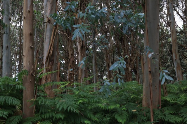 Was ich allerdings über Eukalyptus gelernt habe, passt so gar nicht zum hübschen Ansehen der Bäume. Ursprünglich wohl in Spanien angepflanzt vermehrt sich der Baum nun in enormer Geschwindigkeit. Bisher kannte ich Eukalyptusbäume nur aus Portugal. Was an den wohlriechenden Bäumen so blöd sein soll, wo sie doch so nett zu riechen und anzuschauen sind? Sie verdrängen andere Pflanzen und Bäume – die Farne scheint es nicht zu störe. Ein Eukalyptusbaum schlägt seine Wurzeln ca. 20 Meter tief in die Erde und hinterlässt damit kaum eine Chance für andere Arten.