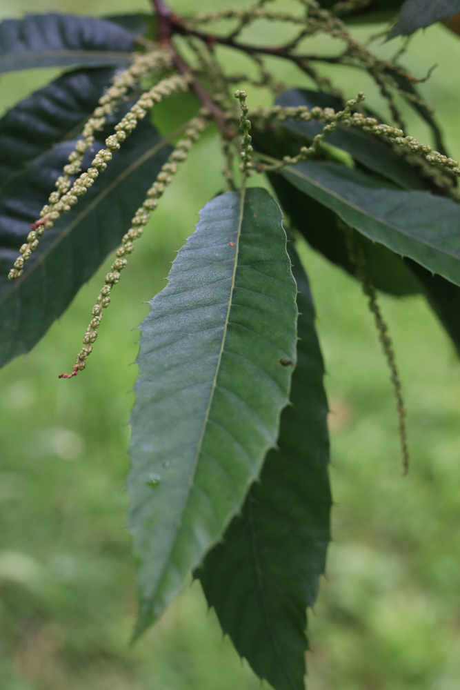 Im Mai beginnt die Edelkastanie zu blühen. Leider habe ich das verpasst. In dieser Zeit schieben sich die kleinen weißen Blüten Richtung Himmel. Allerdings sind die weißen Blüten die männlichen. Die weiblichen bilden sich danach (also ungefähr jetzt im Juni/Juli) und sehen grün und unscheinbar aus.