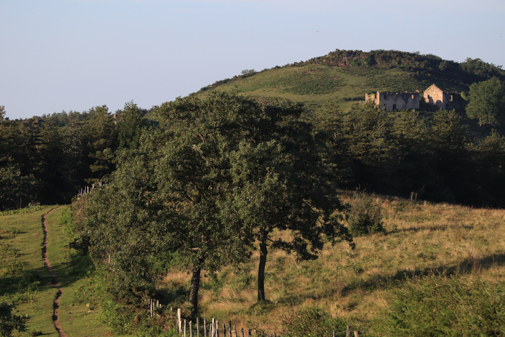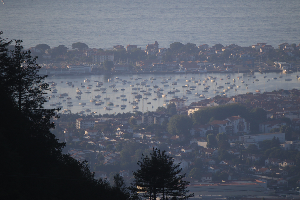 Am Abend mache ich mich noch auf eine kleine Erkundungstour, allerdings nur den nächsten Hügelweg hinauf. Plötzlich stehen da Pferde und schauen mich neugierig an. Ich atme den Geruch der großen Tiere ein, der abendlichen Stimmung und des heuartigen Gras. Der Blick kann sich nicht entscheiden zwischen Meer und La Rhune. Kleine funkelnde Boote oder der brockenähnliche Berg?