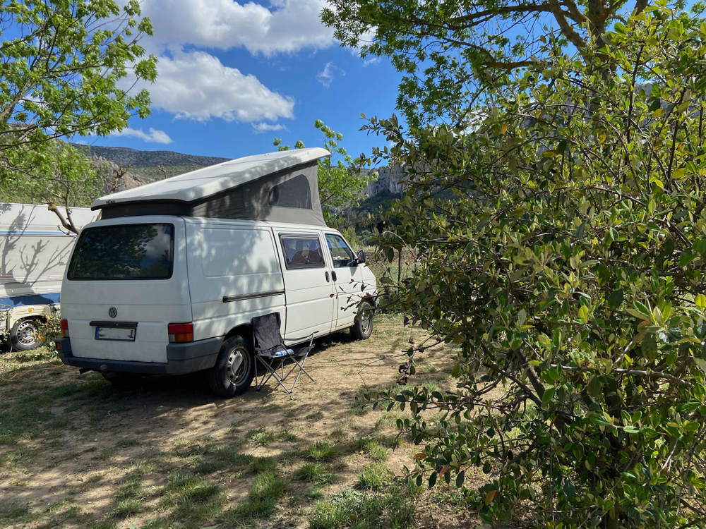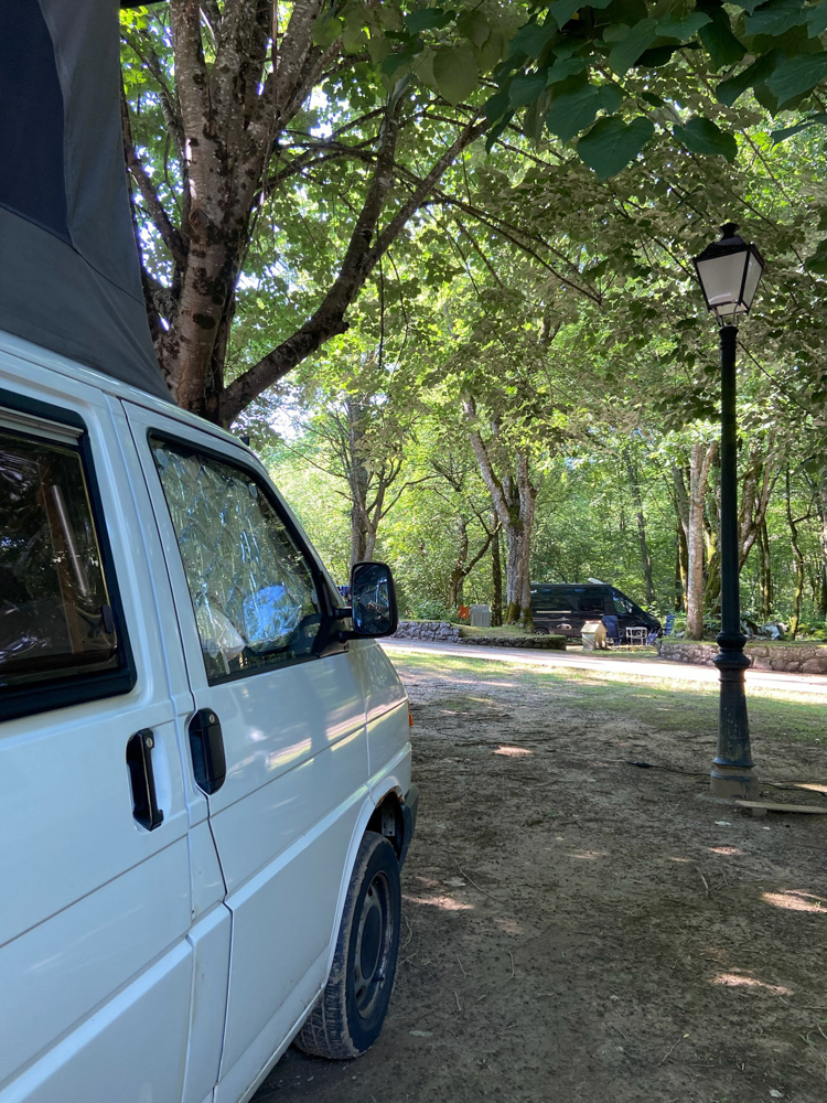 Kein geschotterter Platz und vorher hatte es sehr geregnet. Die Schattenspenden Bäume haben leider dazu beigetragen, dass der Matsch nicht trocknete. Wiese konnte man das auch nicht mehr nennen. Zudem viele seltsame und sehr laute Niederländer:innen und Spanier:innen auf dem Platz. Wir fanden es nur so mäßig und blieben nur eine Nacht. Das dazugehörige Restaurant ist allerdings ganz nett und man hat von dort einen tollen Ausblick auf die Berge.
