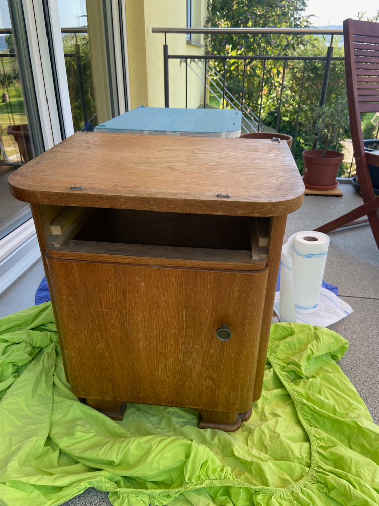 Vor ca. 3 Jahren habe ich auf Kleinanzeigen Nachttische gefunden. Alte kleine Nachttische, die in einem alten Haus abgeholt werden mussten. Sie standen wohl schon etwas länger auf dem Dachboden. Bei dem einen schloss die eine Tür nicht mehr richtig und bei beiden fehlten die Glasplattenauflagen. Machte mir aber nichts, denn an alten Dingen kann ich selten gut vorbei gehen. Außerdem kosteten die beiden Tischchen eigentlich so gut wie nichts. Als ich zuhause die Schubladen öffnete, fand ich eine uralte Hochzeitseinladung, einen Ring und eine Beipackzettel eines Medikamentes. Die Fundstücke waren also inklusive.
