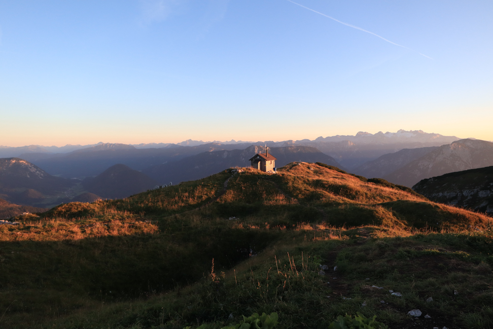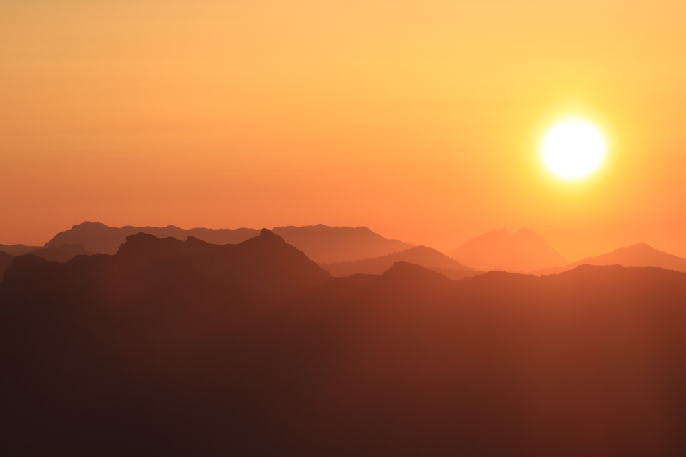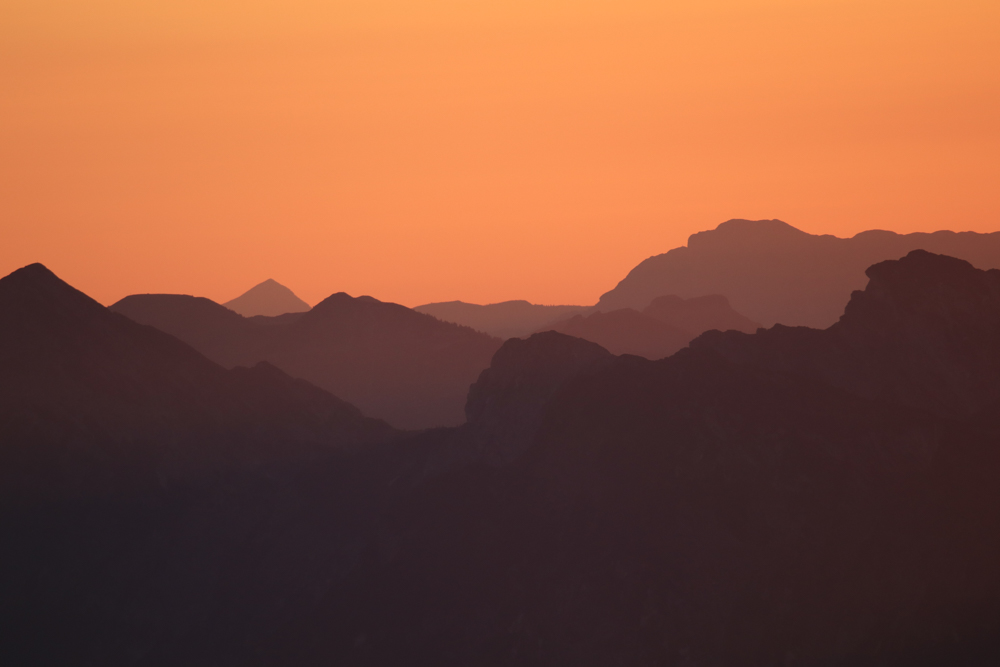 Dabei zeigte sie sich aber sehr ansehnlich. Alle Gipfel und Bergketten in unserer Sichtweite jubelten ihr zu. Die Sonne wurde vor lauter Rührung und so viel Aufmerksamkeit noch röter. Bis sie noch einmal zwinkerte und verschwand. Warmes Licht verharrte wie ein Andenken. Man hätte dieses Bild auch als Sammelbildchen der kitschig schönsten Momente einkleben können.