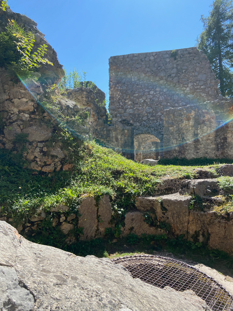 Durch Wald und über Wiesen, über dicke Straßen und schmale Pfade. Unser letztes Ziel war die Ruine Wolkenstein. Hier hatte uns allerdings die Kasnockerl-Müdigkeit schon eingeholt. Wir hatten versucht ihr zu entkommen, schnell genug den Berg hinab zu kugeln, doch es brachte nichts. Ein müder Blick in die zerfallene Burg, ein schneller Blick auf die Infotafeln und weiterkugeln.