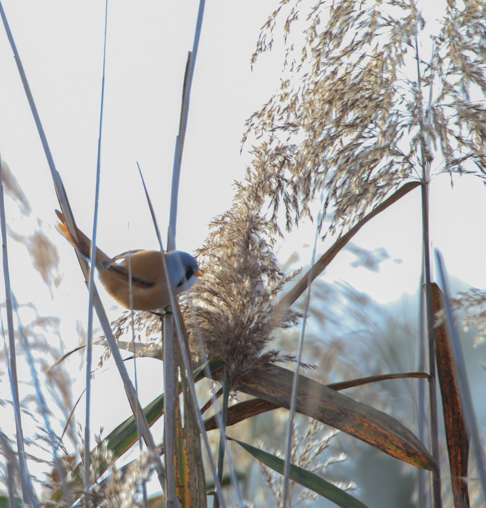 Im Frühjahr bis Herbst ist der Weg zur Mettnau-Spitze gesperrt, damit sich hier Brutvögel ungestört niederlassen können. Meine Hoffnung ist es, heute hier einige Zugvögel zu erspähen. Der Weg vom Turm zur Spitze ist ein kleiner Spaziergang durch hohes Schilf, über ein Wiesenfeld und vorbei an immer wieder hohen Büschen und alten Bäumen. Plötzlich sind sie direkt neben uns: Bartmeisen. Ich habe vorher noch nie welche gesehen. Weil ich in dem Moment so aufgeregt bin, schieße ich wild drei Fotos, ohne auf irgendwelche Einstellungen zu achten.