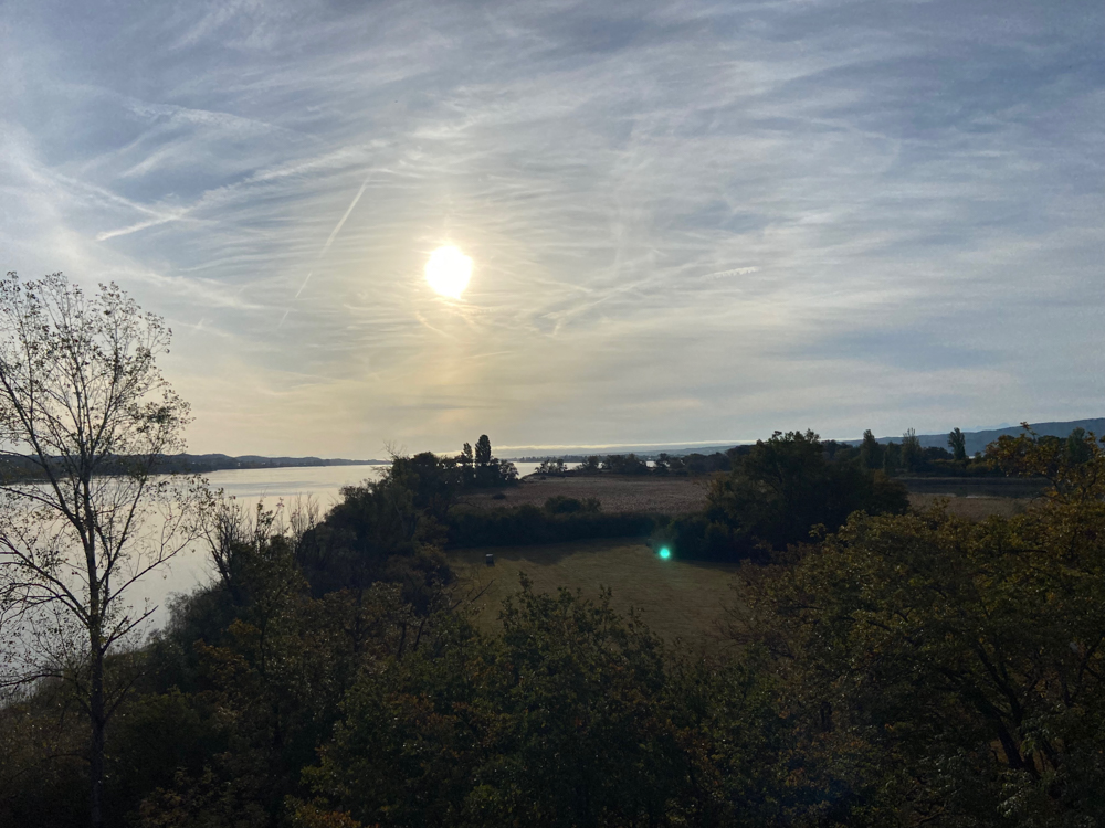 Die Luft ist kalt an diesem Morgen. Kalte Luft mag ich. Sie fühlt sich immer so frisch und belebend an. Sie füllt die Lungen mit Energie. Mit dicker Jacke, Stirnband und Schal ziehen wir los ins Naturschutzgebiet. Es ist ruhig an diesem Montagmorgen. Die Menschen müssen arbeiten. Zuerst laufen wir an den still liegenden Kurkliniken vorbei und durch den Ort. Am Mettnauturm steigen wir die Stufen hinauf. Alles knarzt. Der Aufstieg wird immer enger, bis man oben auf der Aussichtsplattform steht. Vor uns liegt eine Halbinsel, die schon lange Naturschutzgebiet ist.