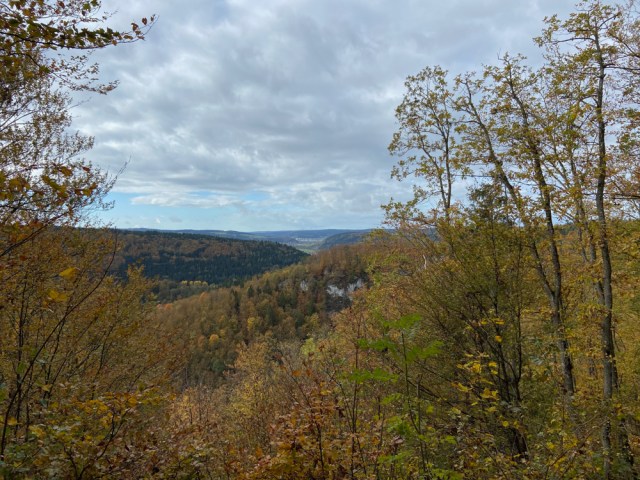 Waldlaub klebt am matschigen Boden. Es hatte geregnet in den letzten Tagen. Im Donautal soll der Herbst besonders schön sein. Schon auf der Fahrt hinter Stockach fängt die Farbenpracht an: Gelbe Buchen, roter Ahorn, dazwischen die noch fast grünen Eichen. Ein Blick auf die Alpen, die sich leider hinter Regenschleiern verbergen. Der kurze Spielplatzausflug am Parkplatz und eine 6 km Wanderung.