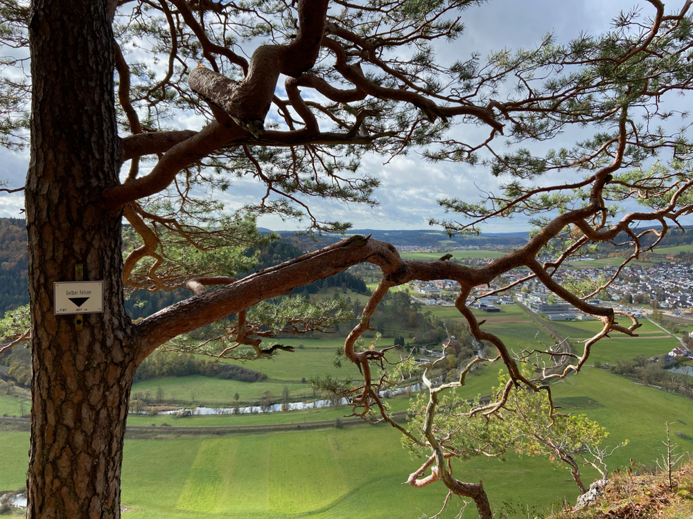 Aussichtsreiche Weitsicht vom gelben Felsen aus. Knorrige Kiefern wachsen ins Bild hinein. Der Fluss schaut aus wie Biberland. Umgefallene Bäume liegen im Nebenarm. Sonst ist alles sehr aufgeräumt: Die Wiesen, die Felder, die Orte, der Fluss begradigt. Selbst der Wald hat seine gute Kleidung angezogen.