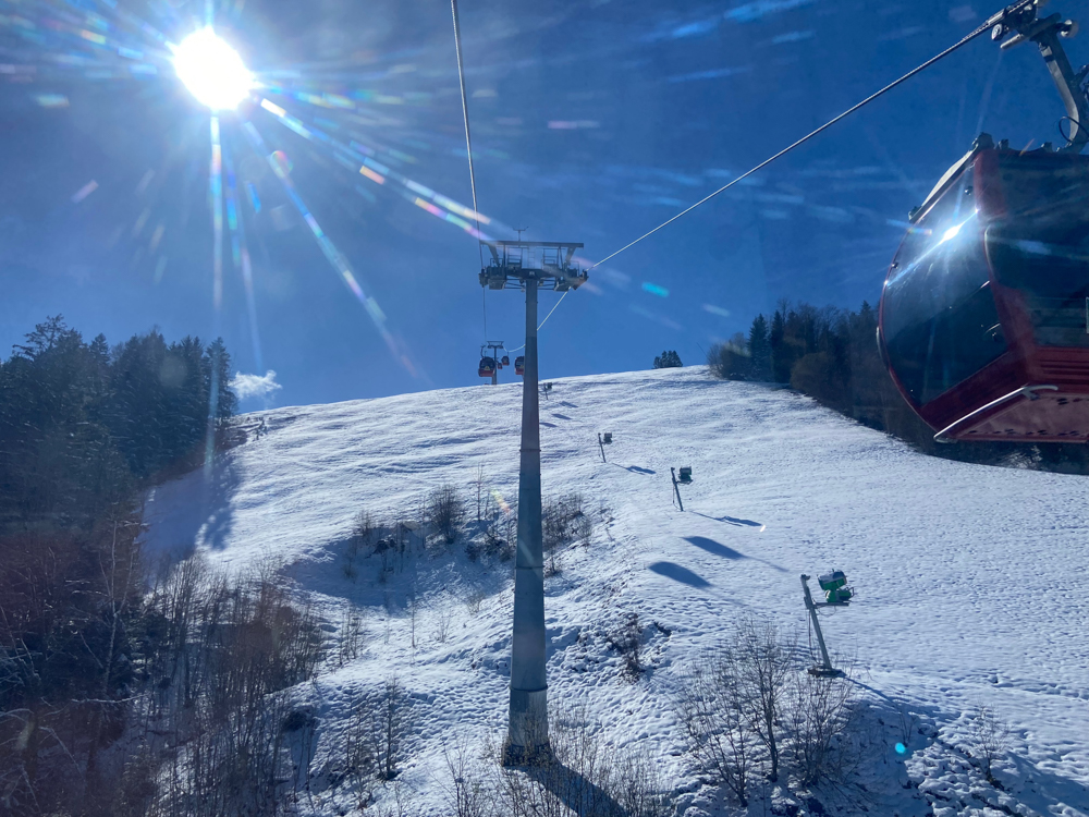 Nach dem verschneiten Vortag zeigte sich das Allgäu plötzlich in einem ganz anderen Licht. Viel freundlicher, viel heller. Die Sonne schien, der Schnee glitzerte. Wir entschieden eine Wanderung auf dem Hündle zu unternehmen. Mit der Oberstaufen Plus Karte ging es in den luxuriösen Gondeln den Berg hinauf. Zum Glück waren die Schneekanonen nicht mehr an. Ich bin kein Fand von Wintersport und frage mich jedes Mal, wie lange das wohl noch gut gehen mag.