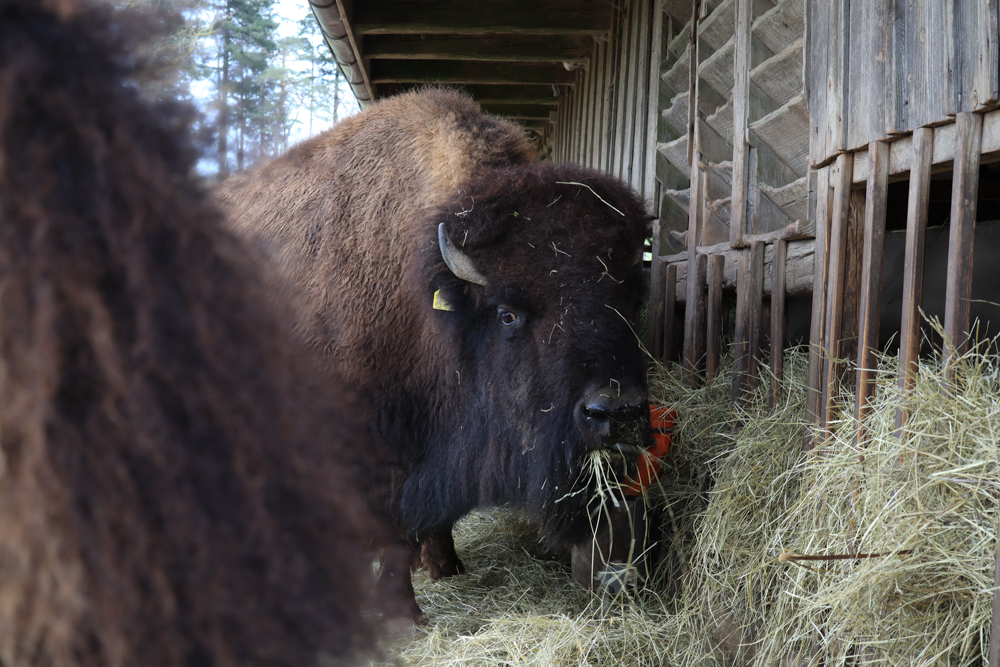 Durch den Wald ging es dann weiter bis zu den Bison Stuben. Heute waren die Bisons auch wieder da. Zumindest eine handvoll. Ich hörte ganz aufmerksam dem tiefen, lauten Atem der riesigen Tiere zu. Heute konnten wir bis zum Zaun herantreten. Während die einen dösten, futterten die anderen Heu. Für mich ein wunderbarer Moment, diesen schönen Tieren so nah zu sein. Ein paar Meter weiter wurde dann die Bisonwurst angeboten… Wer kann die noch essen, wenn er vorher diese coolen Tiere lebend gesehen hat?
