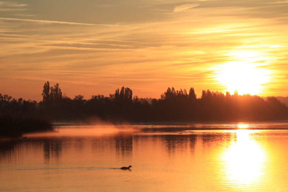 Ich begegnete niemanden. Wer war auch sonst so verrückt, sonntags um 6 Uhr aufzustehen, nur um einen Vogel zu suchen. Immerhin fand ich ihn. In mehrfacher Ausführung. Die Nachtigall schlug mir mit einer Energie ihren Gesang entgegen, dass jegliche Müdigkeit mit ihm davon flog. Die Geräuschkulisse war einfach zauberhaft. Vogelmelodien und sonst nur Stille. Keine Autos, keine Menschen, kein störender Lärm. Wunderbar anzusehen war auch der Sonnenaufgang, den ich vom Ufer aus beobachten durfte. Ein wahres Spektakel an Schönheit. Nebel stieg vom kühlen Wasser empor, Schwäne schlugen ihr Flügel auf und die Sonne tauchte alles in Bilderbuchatmosphäre. Da ließ ich dann sogar mal kurz die Nachtigall links liegen.