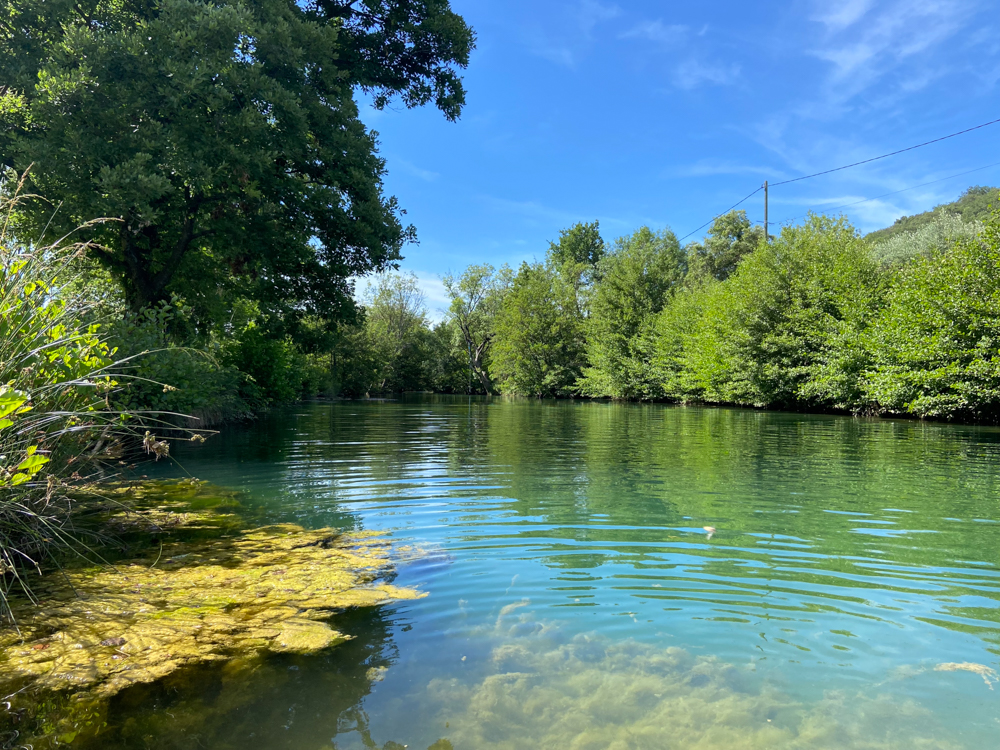 Den ersten Nachmittag verbringen wir auf der großen Terrasse im Schatten, lassen die Seele und die Beine baumeln. In der Sonne ist es nicht aushaltbar. Wir haben schon den kleinen Tipp der Badestelle am Fluss erhalten. Also machen wir uns auf den Weg. Das Wasser ist eiskalt, ganz anders als heute Morgen. Aber ist man erst einmal drin und vor allem dann wieder draußen, fühlt es sich richtig gut an. Das Wasser scheint immer so kalt zu sein, da es unterirdische Quellen gibt, die den Fluss immer wieder mit kalten Wasser speisen.